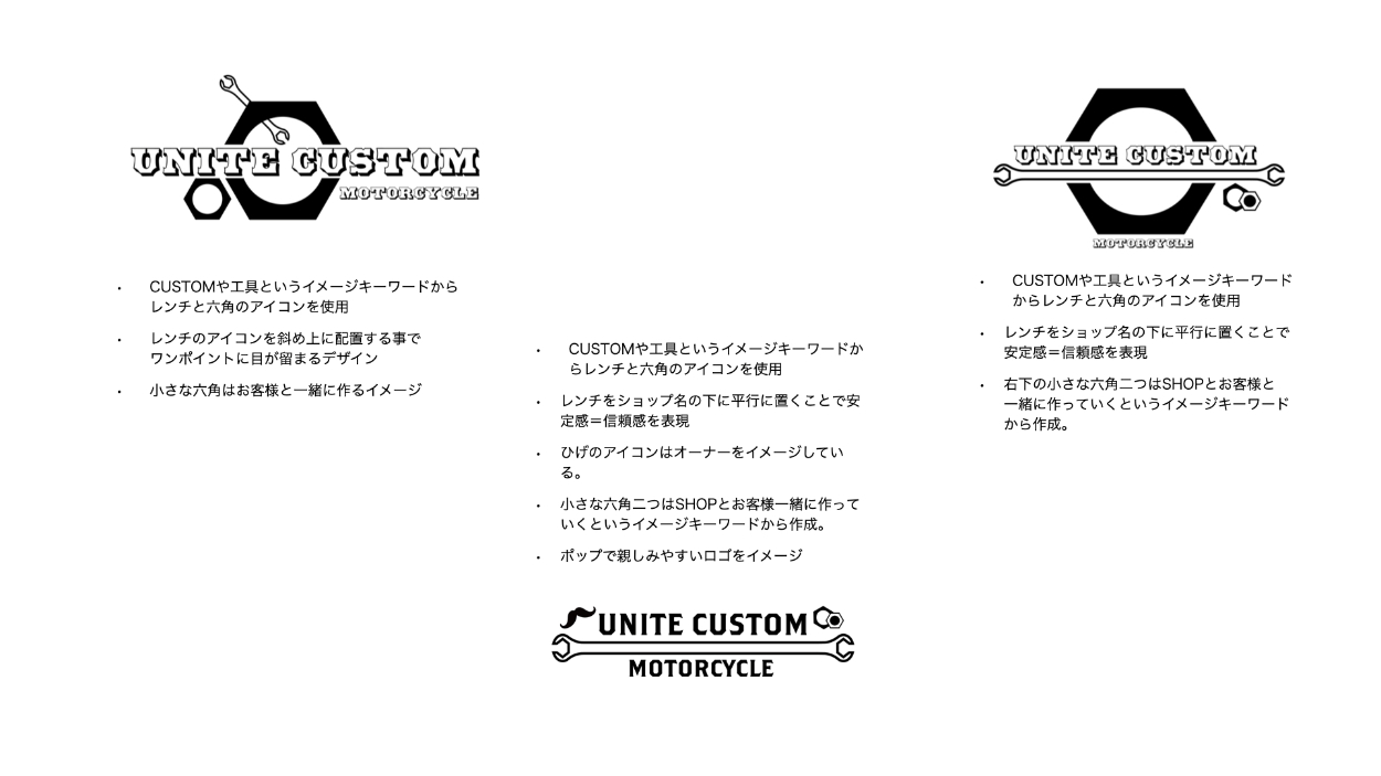 ロゴデザイン制作・ステッカー制作 AIRI YAMADA フリーランスデザイナー OVERVIEW バイクショップUNITE CUSTOM MOTORCYCLE様 ロゴデザイン制作・ステッカー制作 YEAR 2024 Image Keyword「一緒に作る・工具・CUSTOM」などからロゴデザイン3案を作成。横並びタイプ背景が黒のタイプステッカー制作