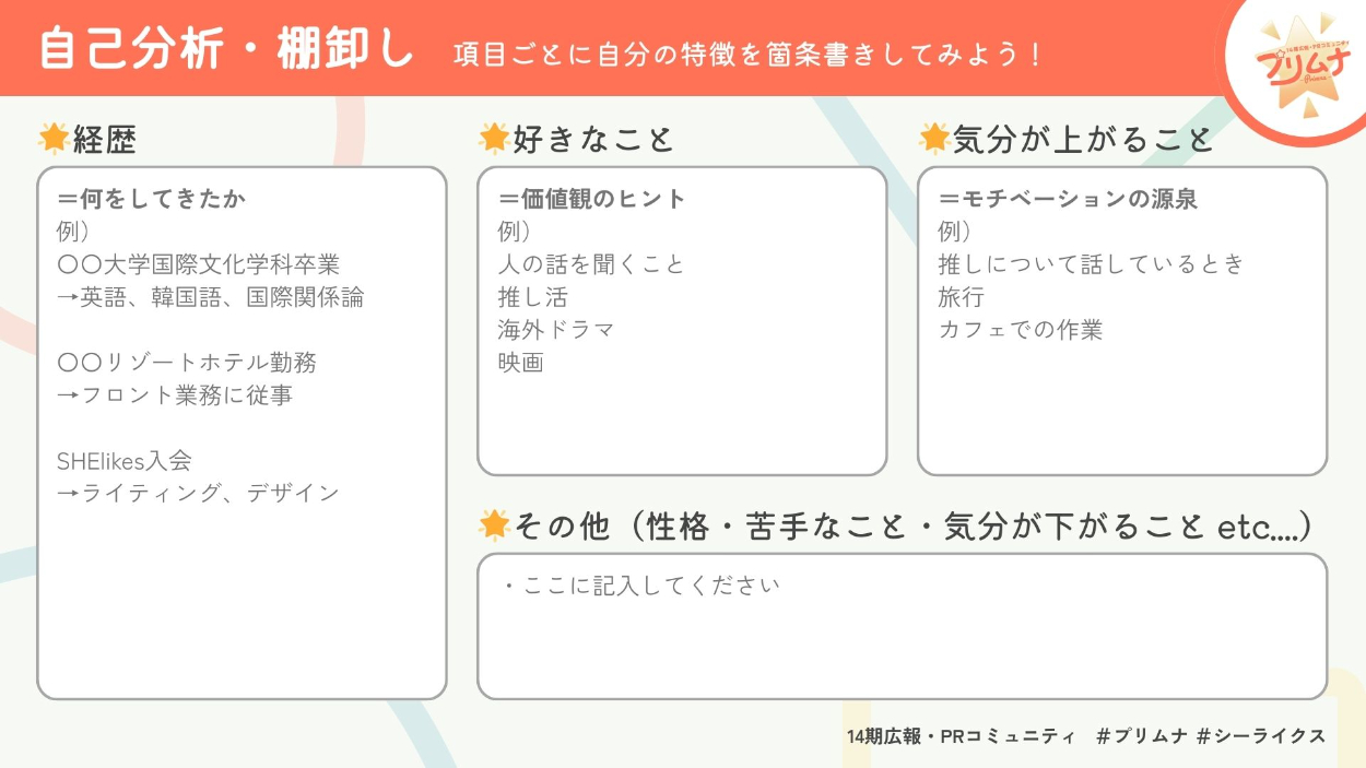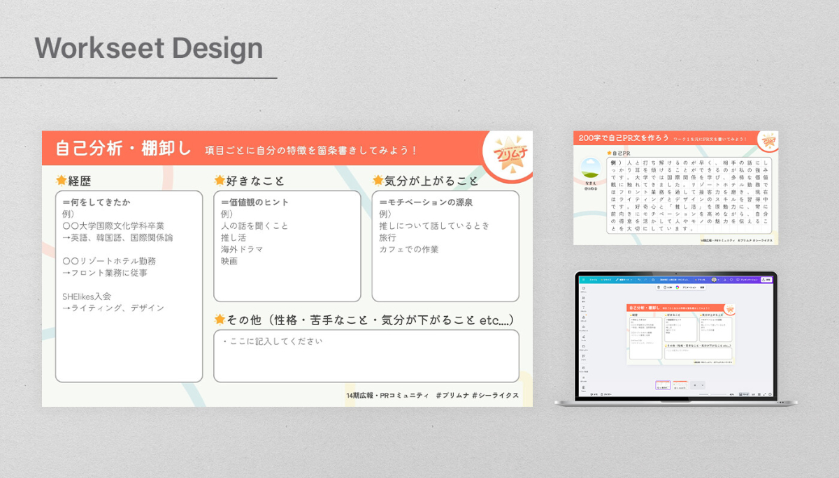 キャリアスクール『SHElikes』内の広報・PRコミュニティ主催で行う会員限定イベントのワークシートを制作しました。 制作期間:1週間