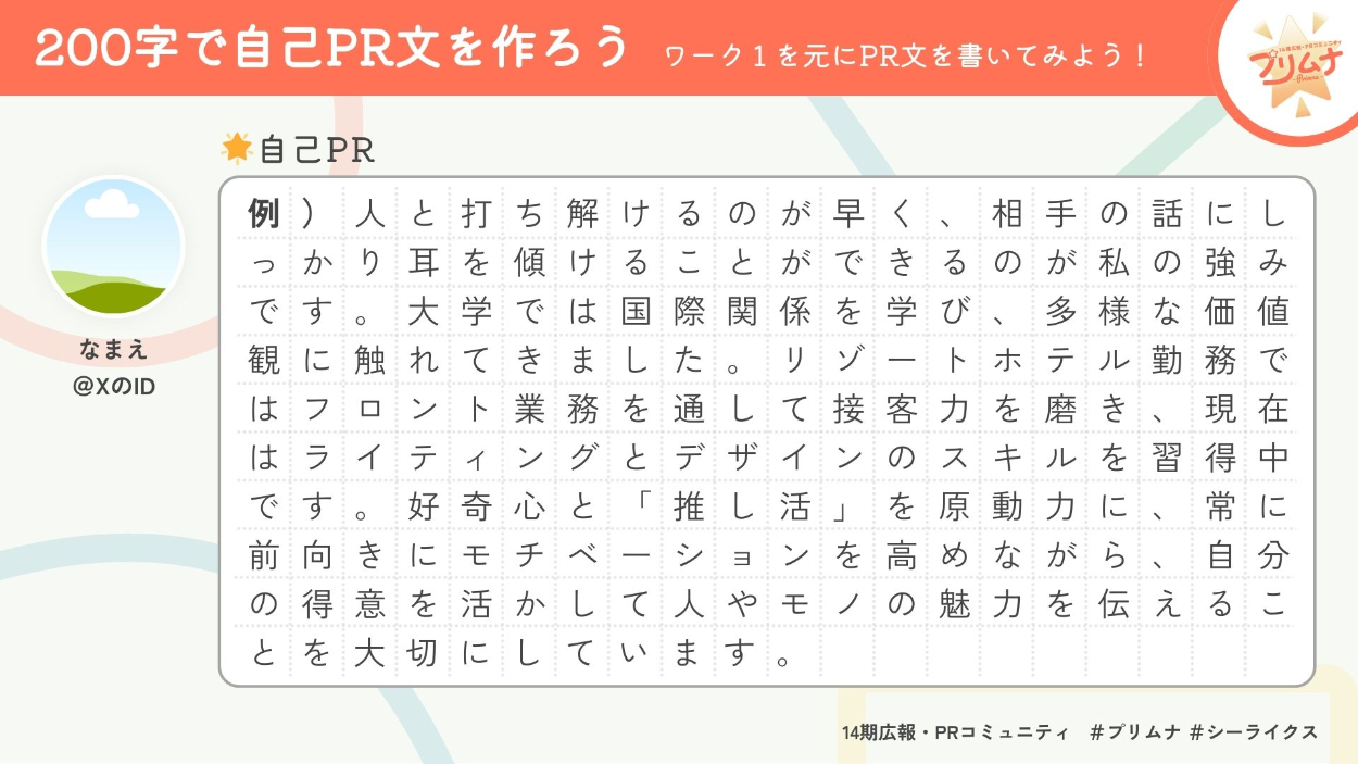 Canva版では、イベント参加者が200文字の自己PRを作りやすいよう、10×20=200のマス目を作り、記入用テキストボックスの文字間・行間を調子することで、打っている文字数を数えなくても視覚的に分かるようにした。