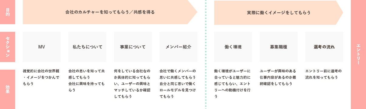 今回の目的はカルチャーマッチする人にエントリーをしてもらうことである。 そのため、前半部でカルチャーマッチしているかを判断してもらった上で実際に働くイメージ、エントリーをしてもらえるような情報設計にしました。