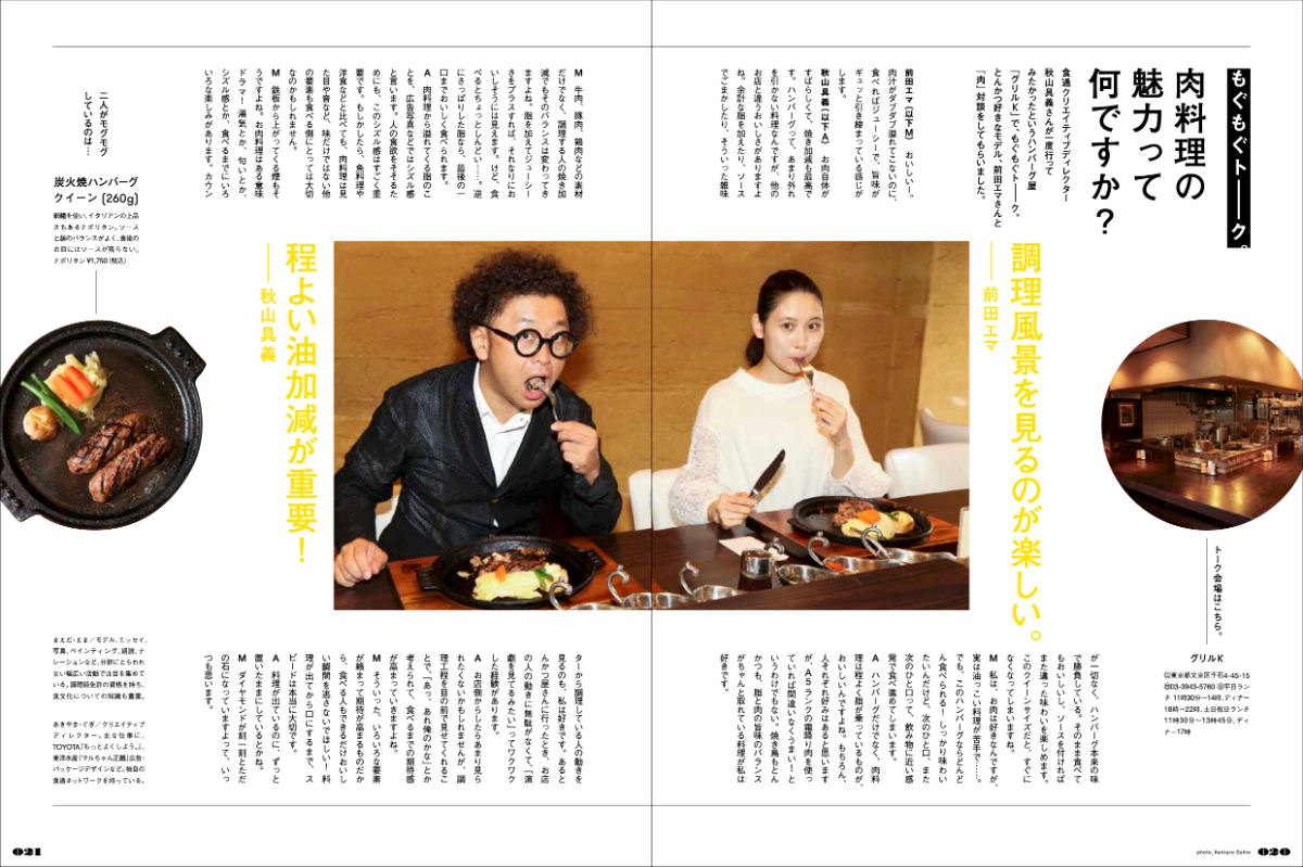 WRITING:対談記事/もぐもぐトーーク。 吉田健二 ディレクター・エディター・ライター OVERVIEW 特集テーマに沿った内容での対談記事。食ビギナーにもわかりやすく伝える内容に。 YEAR 2017 - 2018 WRITING THEMEフランクな会話から「なるほど!」を引き出す。TALK THEME:「スパゲティって、和食ですか?」TALK THEME:「肉料理の魅力って、何ですか?」【担当業務】・取材・撮影ディレクション・原稿作成