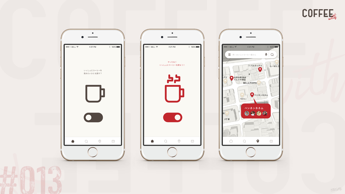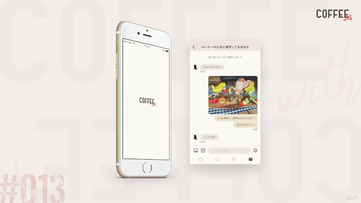 メッセージ画面のお題でした。コーヒーをいっしょに飲めるひとをリアルタイムで探せるアプリを制作しました。コーヒー豆の色味や落ち着いた印象を受けるようなカラー設計にしました。