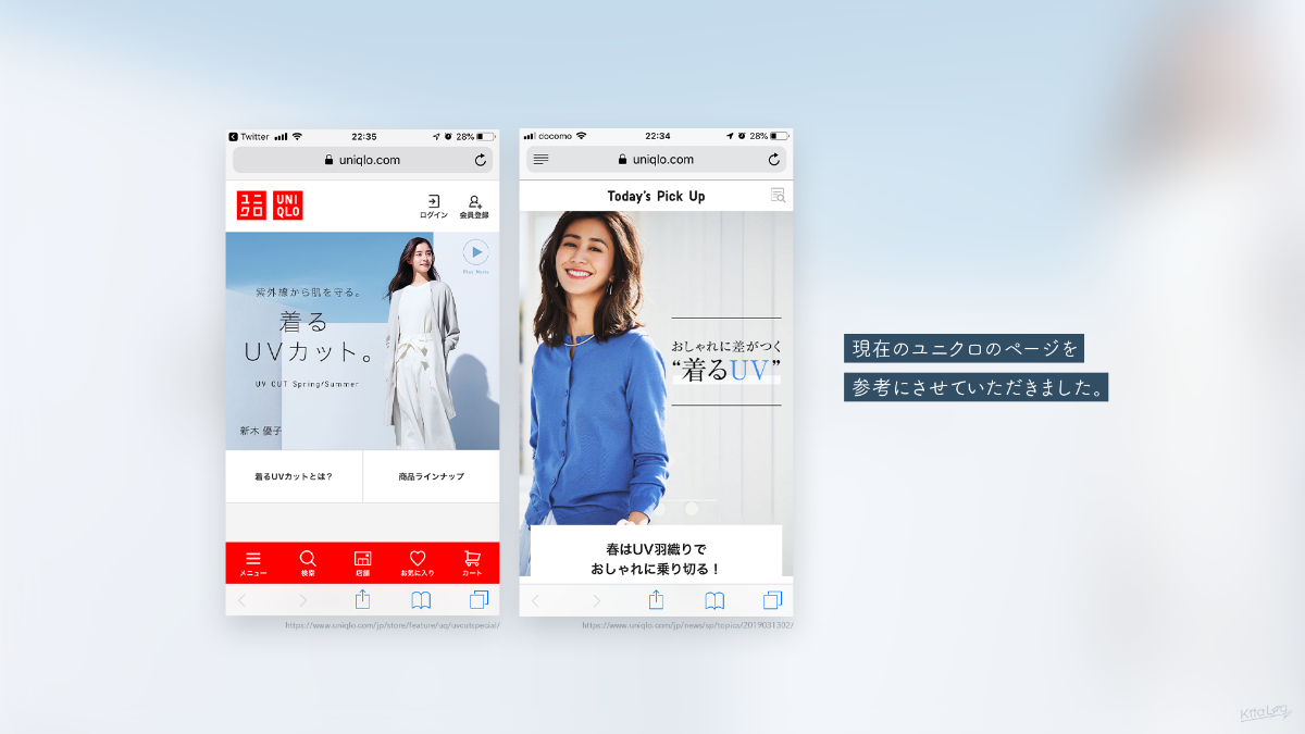 ランディングページのUIです。現状のユニクロさんのページを参考にしながら、自分だったらどう作るだろうと考えながら制作しました。