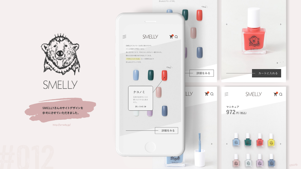 SMELLYさんのネイルページがもしもLPのようなページだったらという想像の元制作しました。This.app のようにクリックすることで詳細がわかるようなデザインだとわくわくするかなと思い制作しました。
