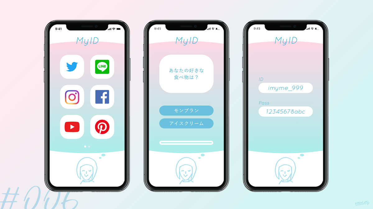 プロフィール画面のお題から自分のSNSのIDとパスワードを管理できるアプリを制作しました。質問に回答することでIDとパスワードを確認できる仕組みです。