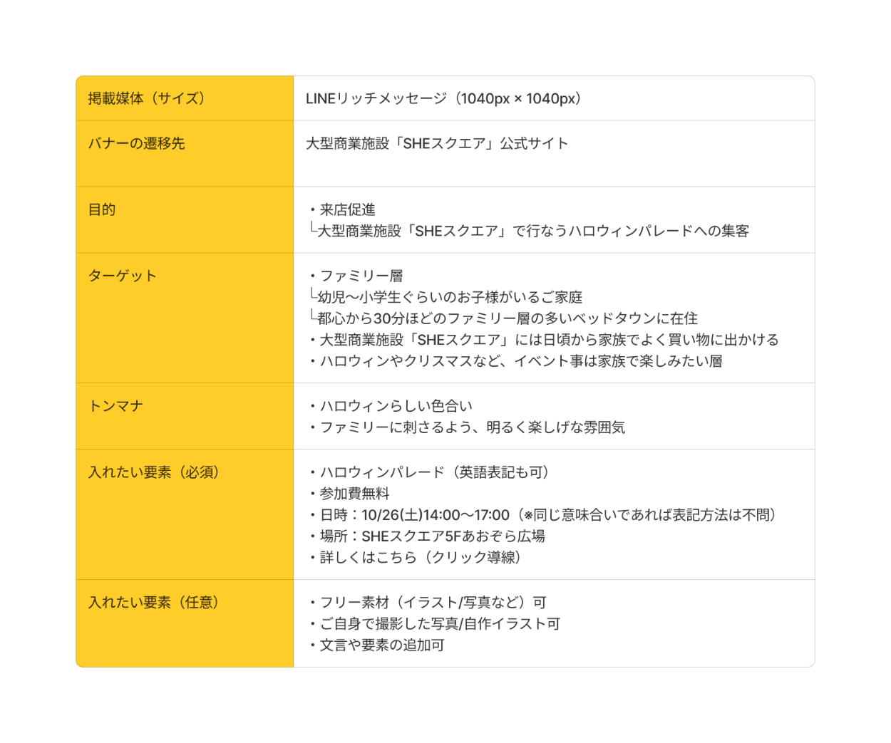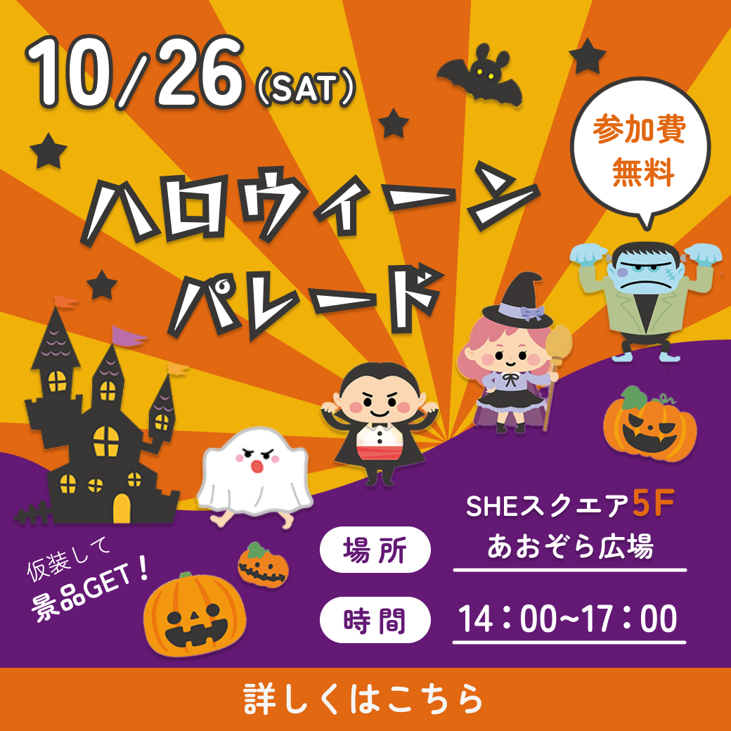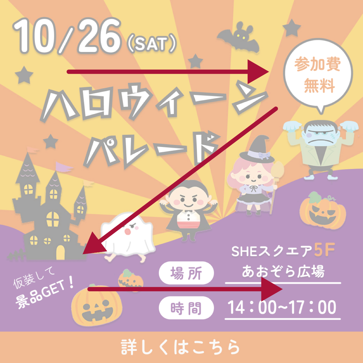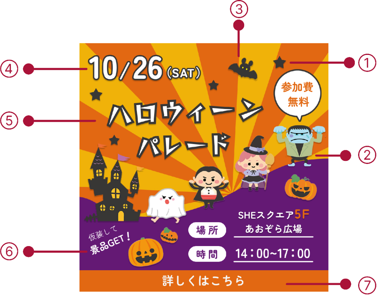⑥「仮装して景品GET!」というキャッチコピーを追加し、来店促進やパレードへの