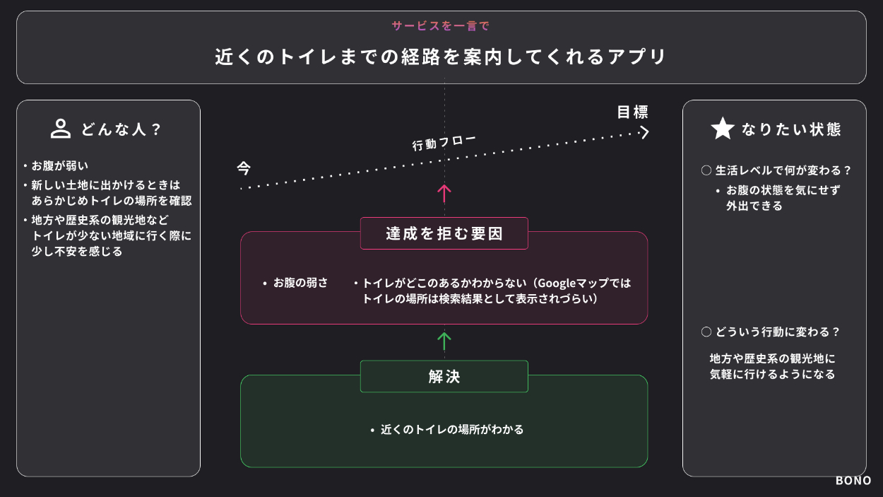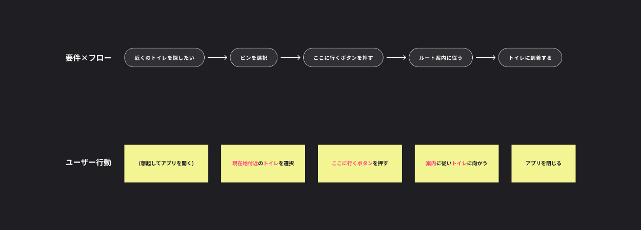 ヒアリングの結果、「たんにトイレにたどり着くことがゴールではない」ということがわかりました。なぜなら、ユーザーはトイレに到着したからと言って安心できるわけではなく、個室に入って初めて不安感から解放されるためです。