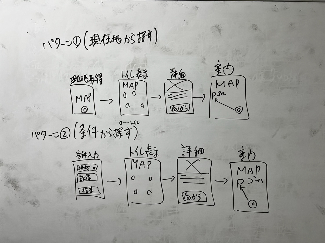 その結果、ユーザーは「いかに早くトイレに行けるか」を重要視すると考え現在地から探す方向性で進むことにしました。