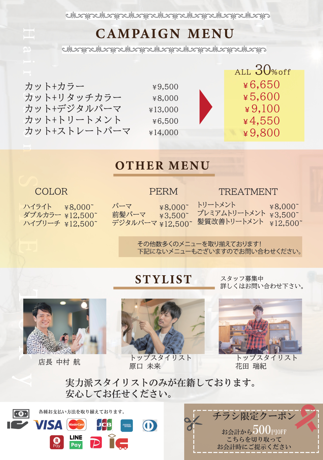 美容院だとぱっとみて分かるようなレイアウト・配色にするため、女性の写真を前面に使うことで第一印象で目を惹くようにしました。表面、裏面ともに美容院の内装をイメージした写真を使用し、入店しやすい情報設計を意識しました。