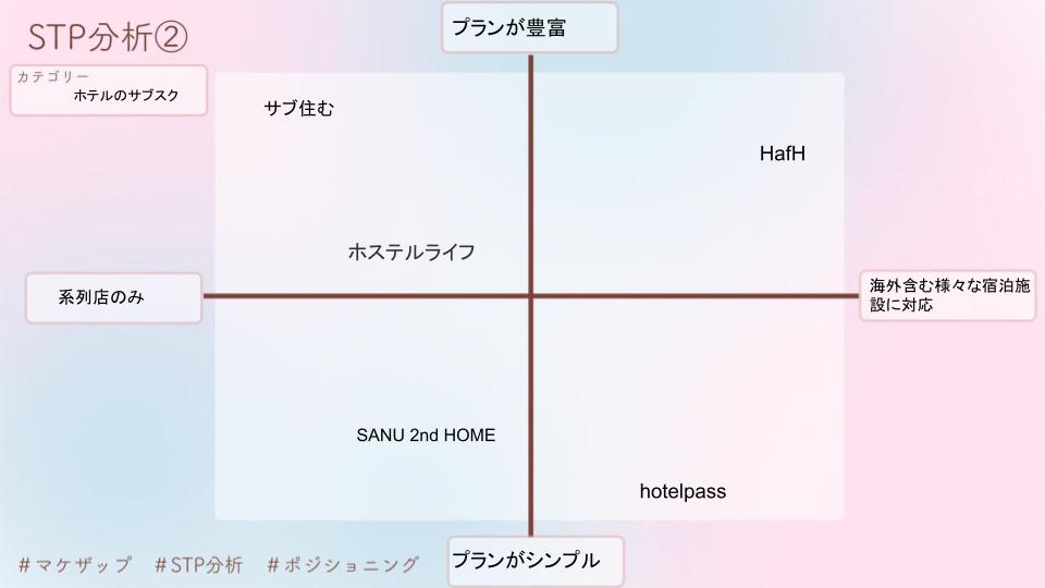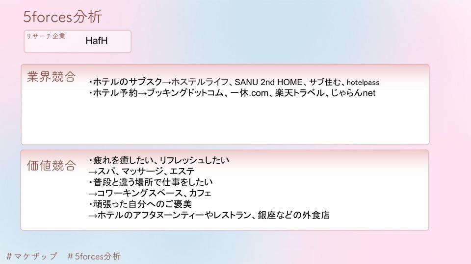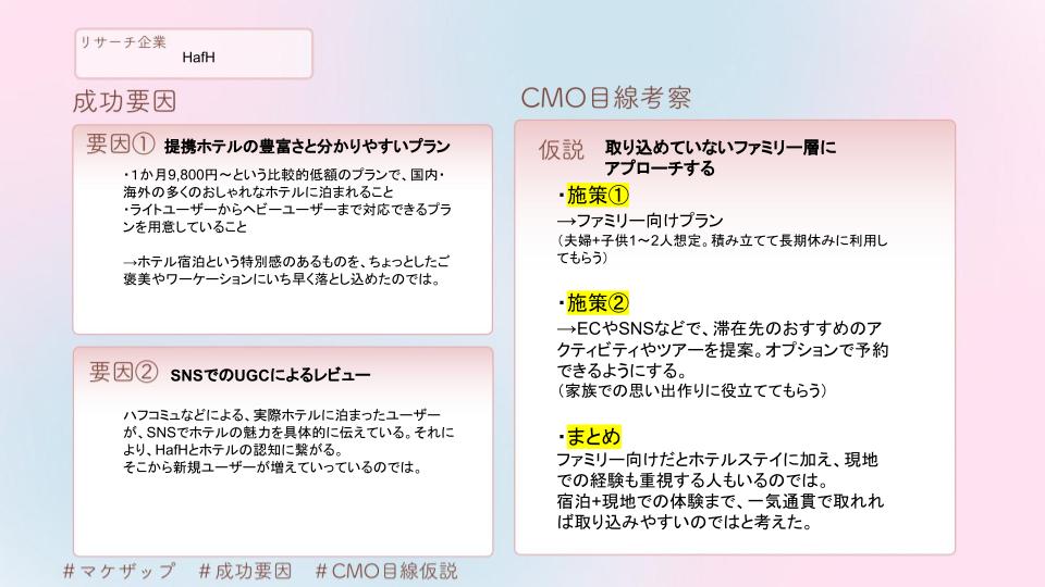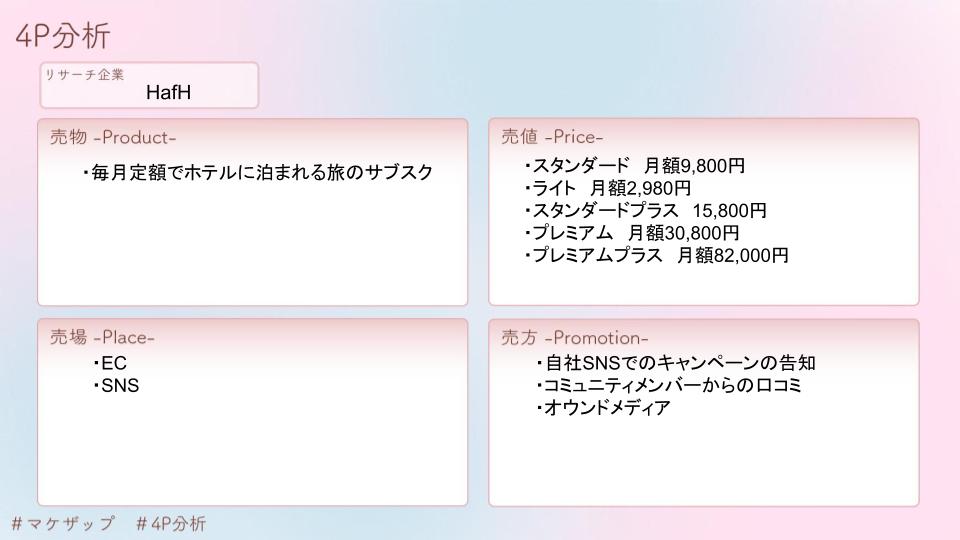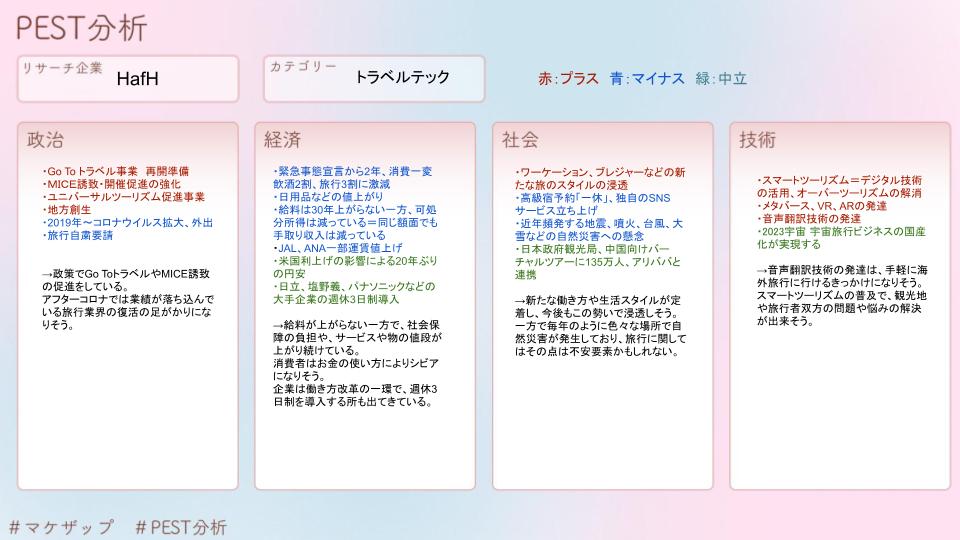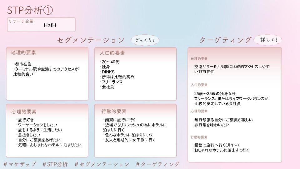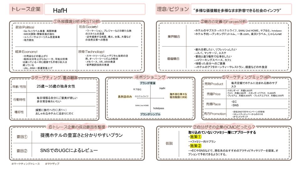 HafHのPEST分析・STP分析・4P分析といったフレームワークでトレースを行いました。下記に貼付した画像がそのシートになります。そしてそれらを最終的に1枚のシートにまとめたものが、カバー画像のものになります。