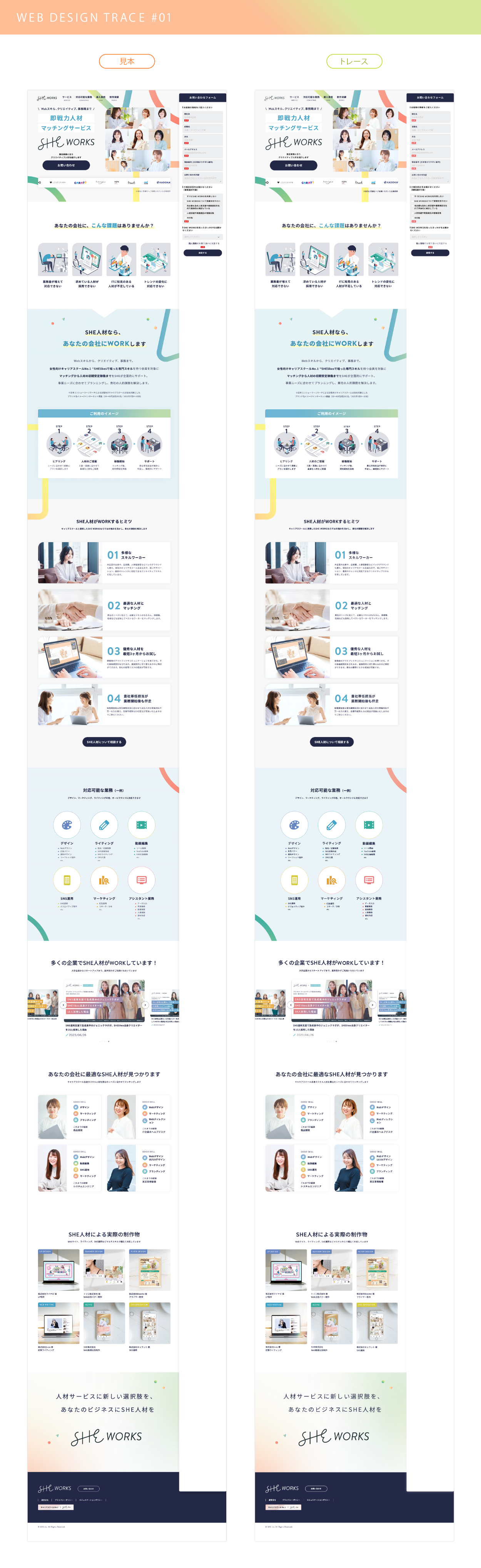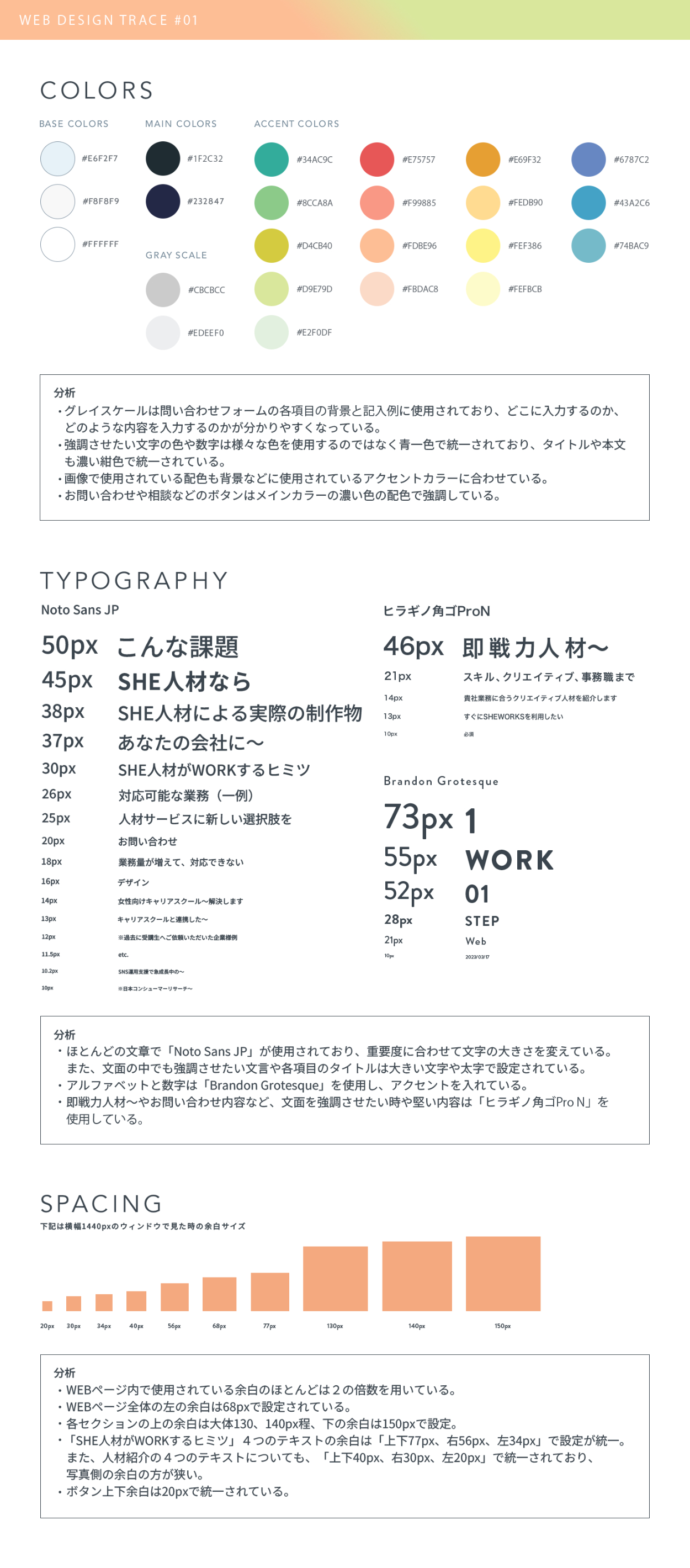 SHElikes MULTI CREATOR COURSEの課題で、WEBサイトトレースに取組みました。(実施内容:WEBサイトトレース/スタイルガイド作成/PCとスマホのレイアウト比較の資料作成)