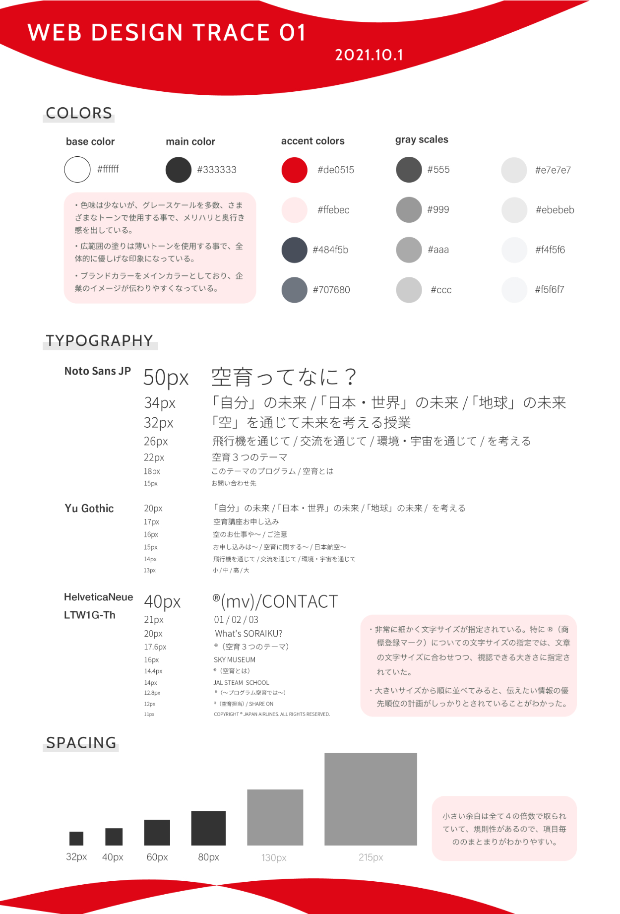 このページでは無彩色の白、黒、グレー(グレーに近い青も含む)以外はほぼJALのアイコンカラーである赤のみの配色になっています。一見色味が乏しく思えますが、グレーの中で異なる明度を使うことによって、メリハリ・奥行き感・まとまり感を出すことができることがわかり、また色味が少ないため全体としてスッキリした印象になることがわかりました。