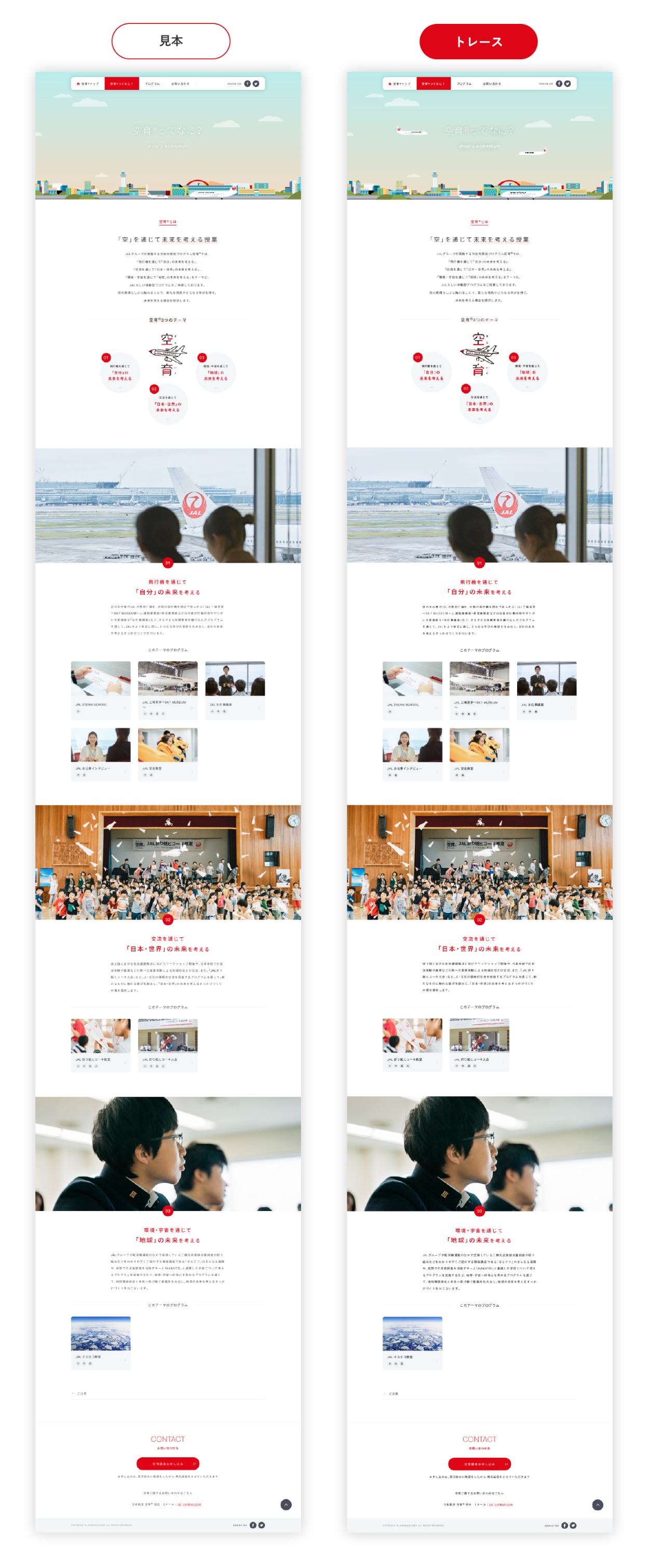 大手航空会社のサイトということで、トンマナや企業のイメージを保ちつつ、お子さんや教育関係の方にも抵抗なくみてもらえるように、角丸四角形や円、薄いトーン、メインビジュアルのイラストなど、かっちりとしつつ優しいデザインになっていると思いました。LP内の画像も小学生から高校生のこどもがメインで写っているものが多く、自社としてこどもたちの未来に何ができるのか?ということがよりしっかりと伝わるLPになっていると思いました。