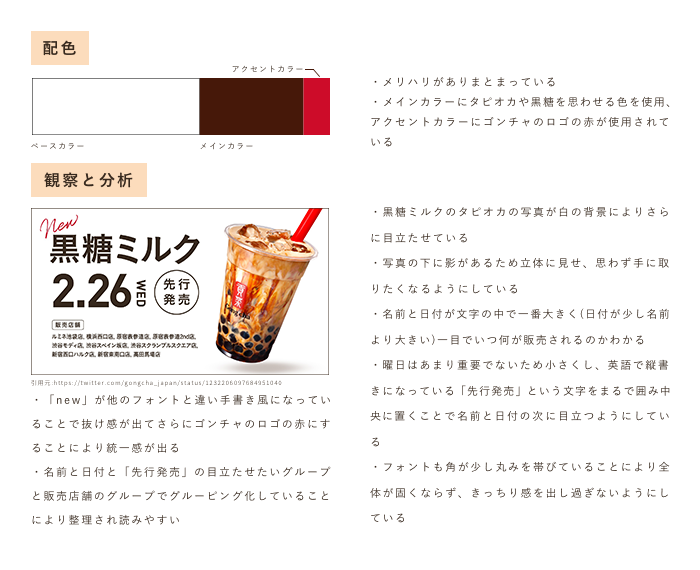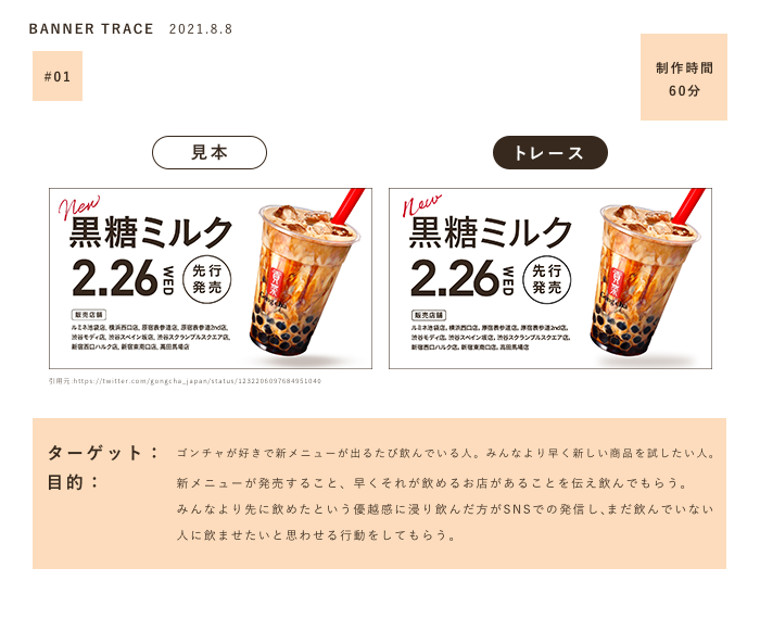 - バナーはTwitterやInstagram、HPなど掲載されている場所でも見せ方は変わってきますが一目で情報が伝わらないといけないので、今回トレースしたバナーは特にその点において重要視されており、例えば使う色が少なくシンプルなデザインですが、文字にメリハリをつけることや、大胆な写真の使い方によって新商品の情報や魅力が一目で伝わるような工夫がされていることを学びました