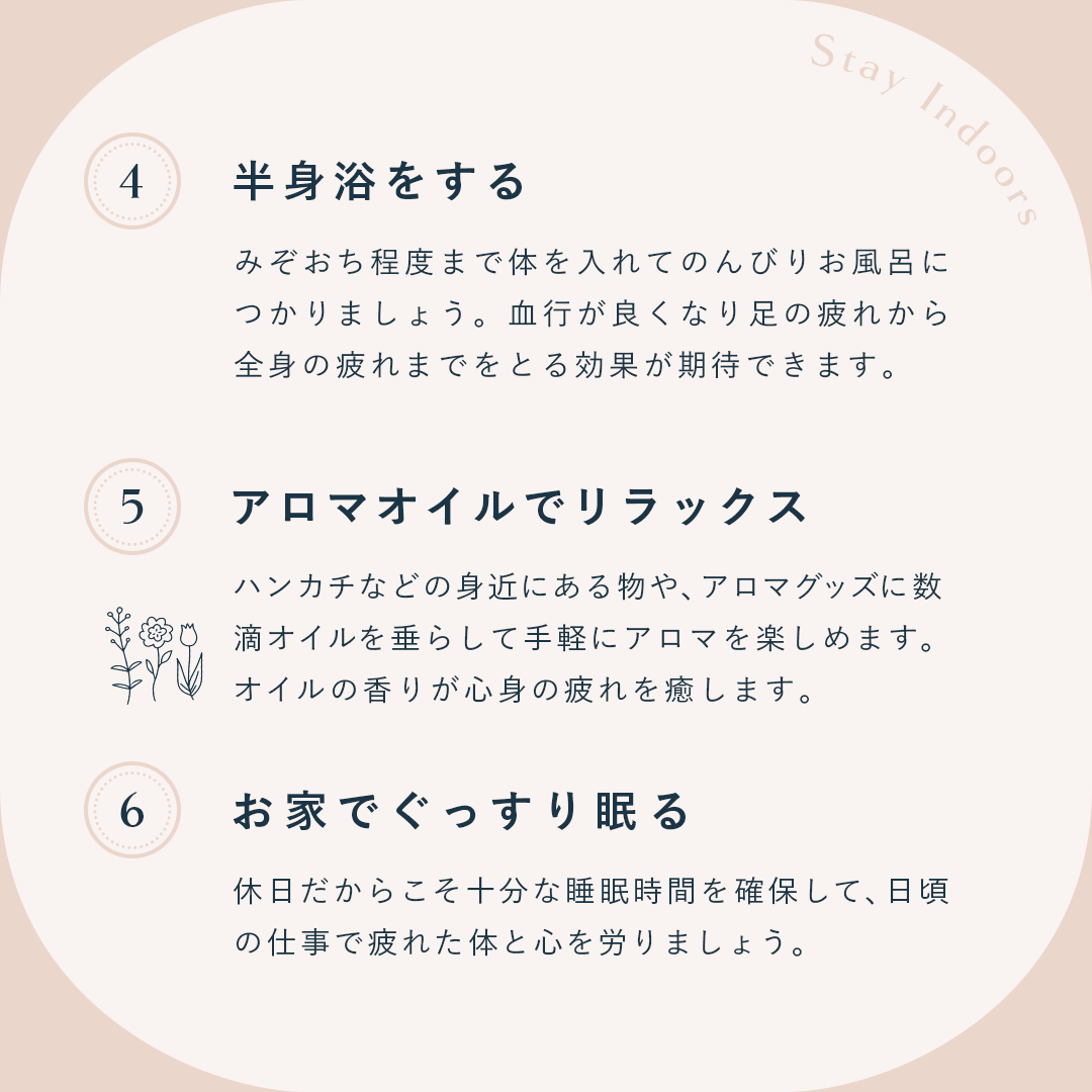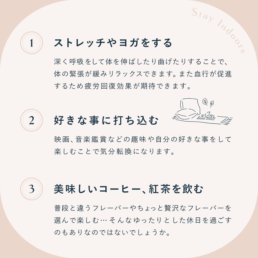 - 1〜2枚目は室内で過ごす方法を、3〜4枚目は屋外で過ごす方法を挙げ、区別がつくように英語のあしらいやカラーを変更をしました。