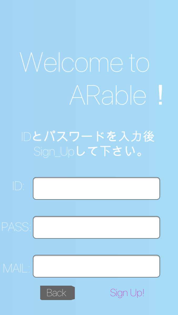 ARableはメールアドレスだけで登録可能です。既に登録済みの方は、ユーザ名とパスワードでログインします。初めてアプリを起動する方は登録する必要があります。