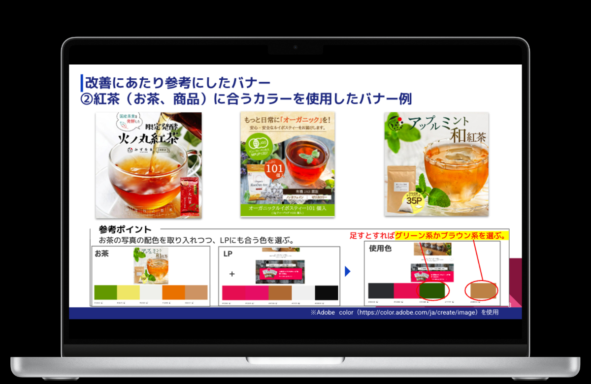 職業訓練の課題として作成。オフィス設置型の紅茶・ハーブティー提供サービスの広告バナーを使って、数値の分析に基づく改善提案を作成しました。(実際にバナーは使用しておりません)