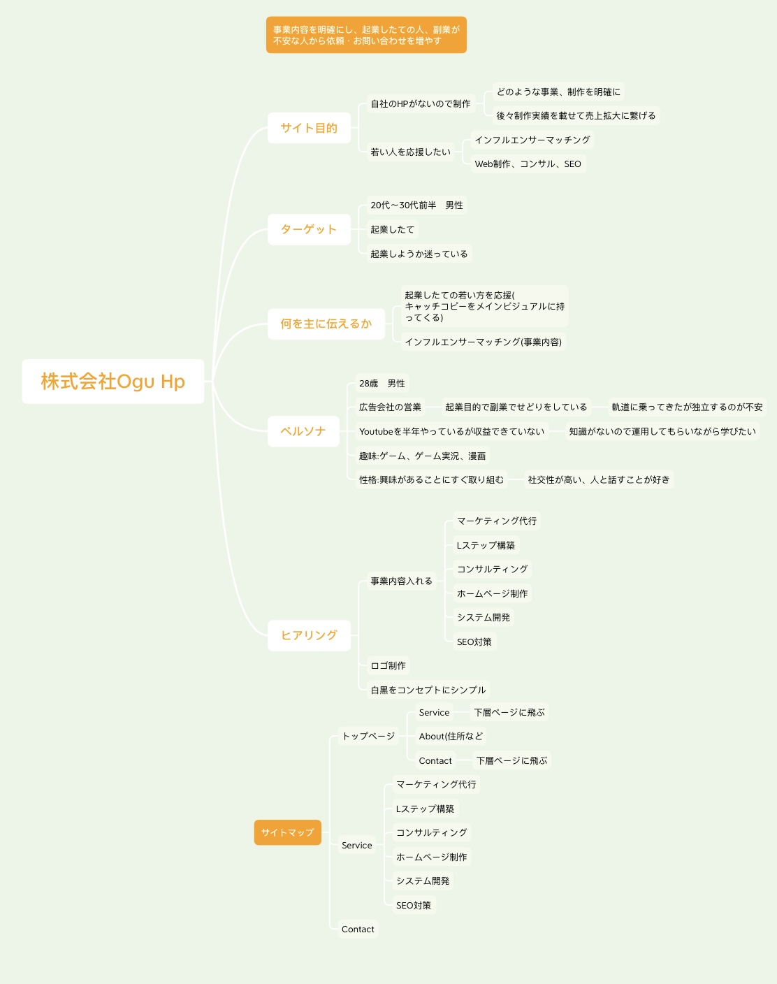 ターゲット、伝えたいこと、ペルソナ、サイトマップをマインドマップに言語化し、共有しながら作成を進めていきました。