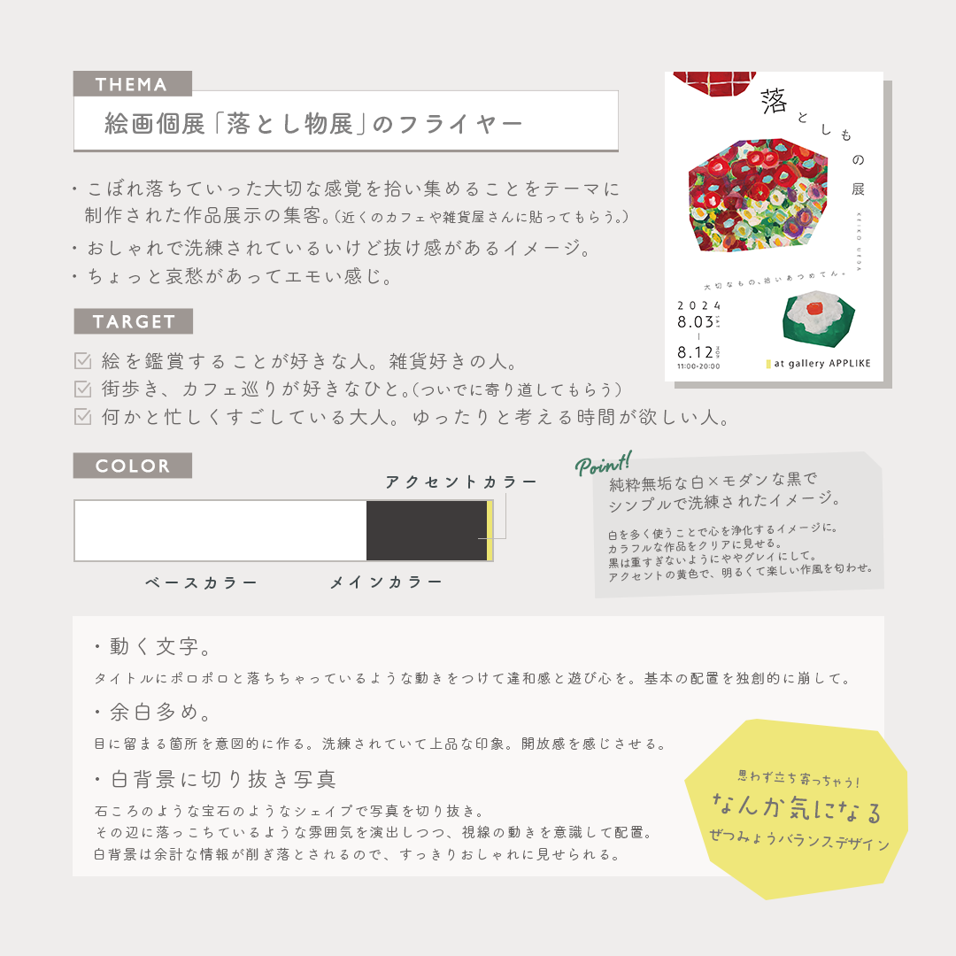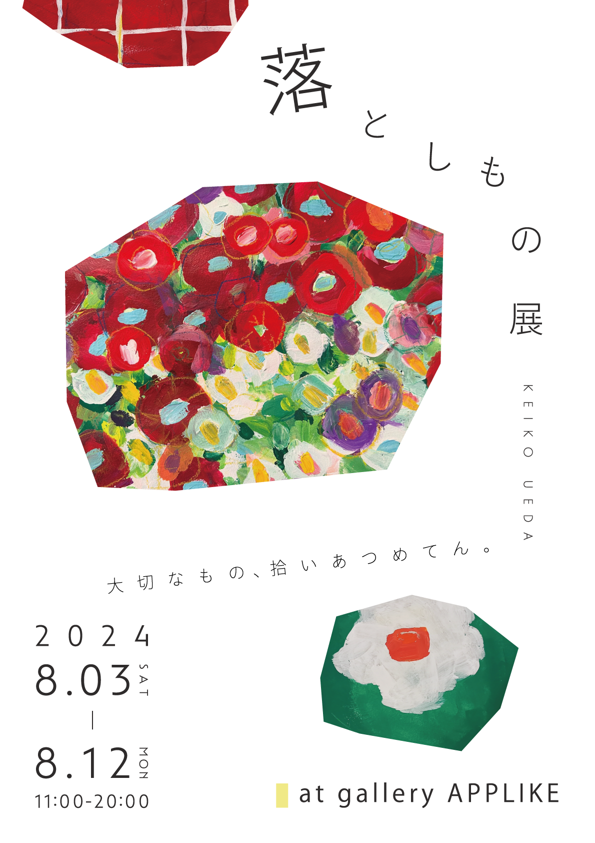 【自主制作】絵画展フライヤー KEIKO UEDA デザイナー/イラストレーター OVERVIEW 2024.5.27/制作時間:5時間/使用ツール:Illustrator/コンセプト:大切な感覚を拾い集める。洗練された空間。 YEAR 2024