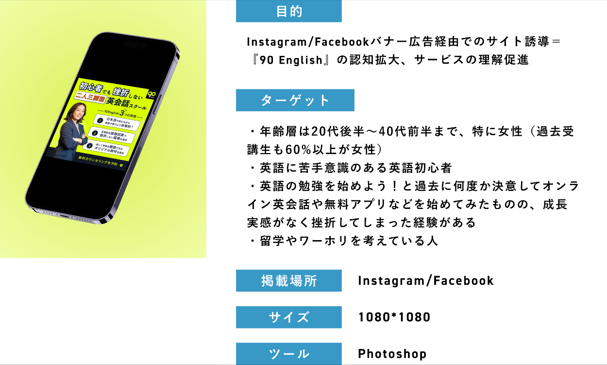 LP先のイメージカラーに合わせ気軽に英語を始められるポップで楽しいイメージを演出しました。濃紺との組み合わせにより可読性を高め、吹き出しやアイコン、背景あしらいなどで親しみやすさを加え、学習へのハードルを下げています。