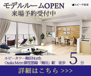 入れて欲しい情報:物件名「ルビータワー梅田North」/モデルルームオープン/来場予約受付中/Osaka Metro御堂筋線「梅田」駅徒歩5分/「詳細はこちら」の誘導ボタン