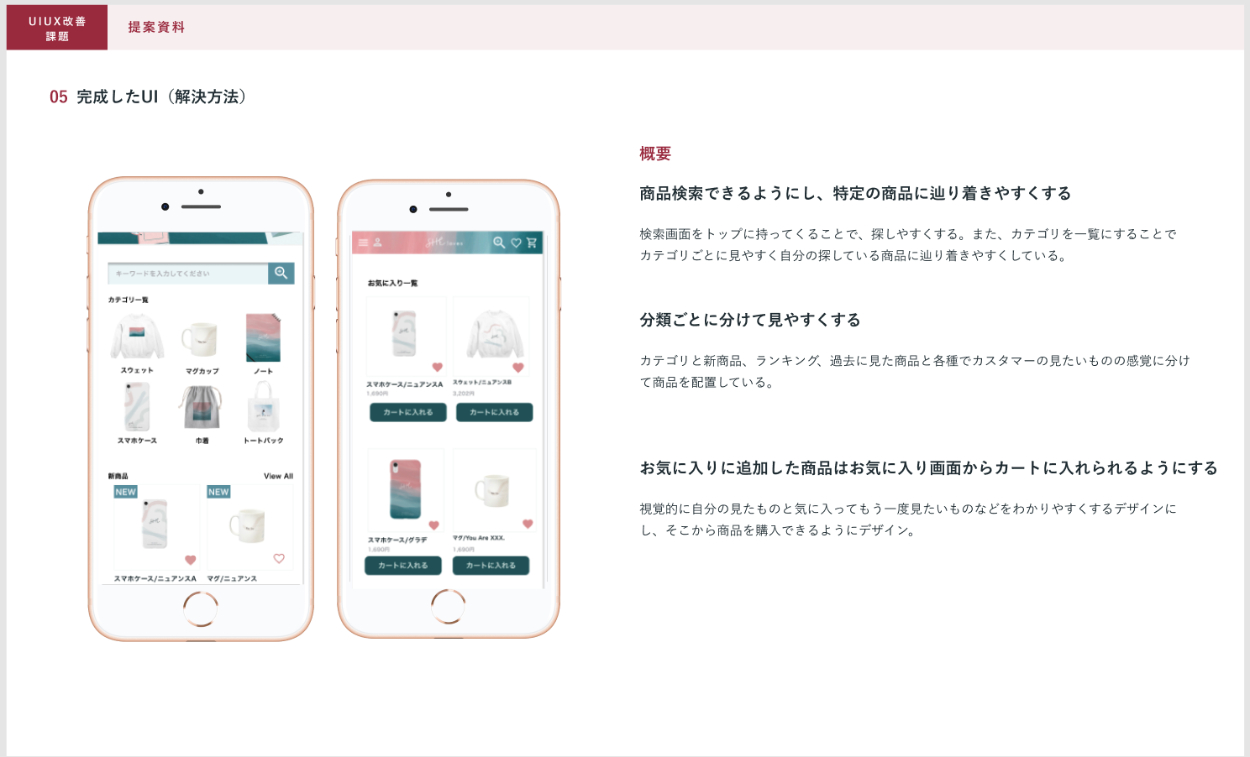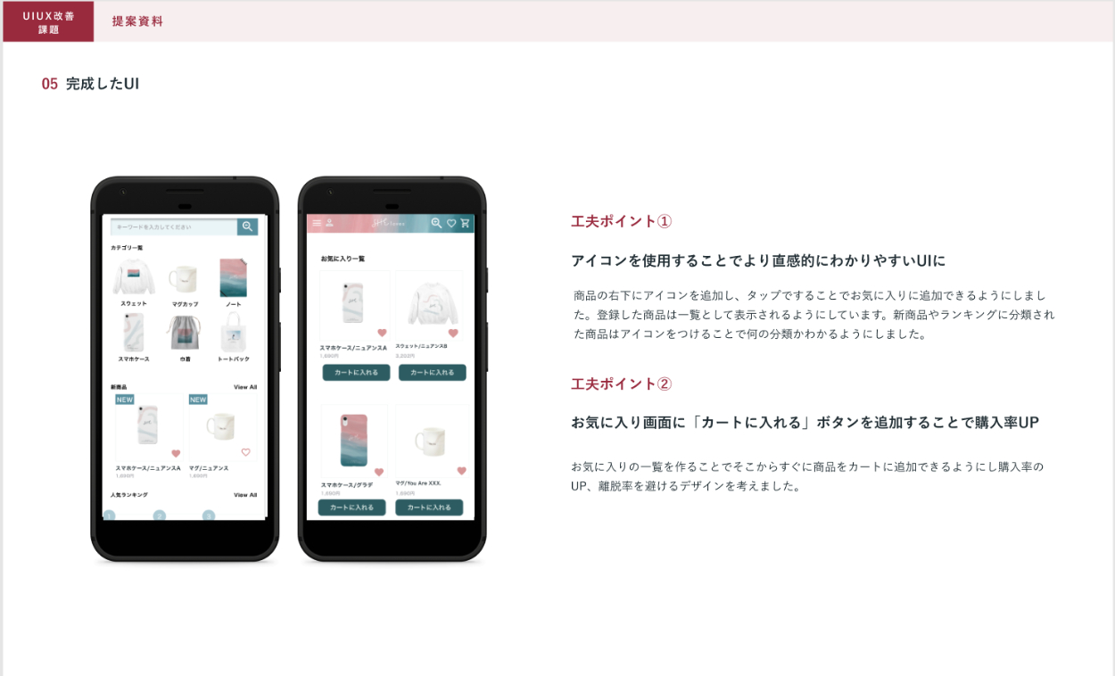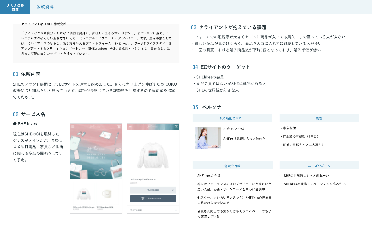 SHE PRO デザイナー課題にて、ECサイトのUI/UX改善提案課題に取り組みました。クライアントから頂いたデザインデータをもとに課題に対して改善案を作成しました。
