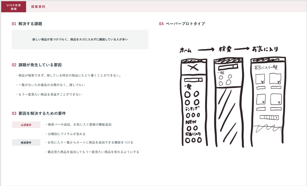 課題:ほしい商品が見つけづらく、商品をカゴに入れずに離脱している人が多い。