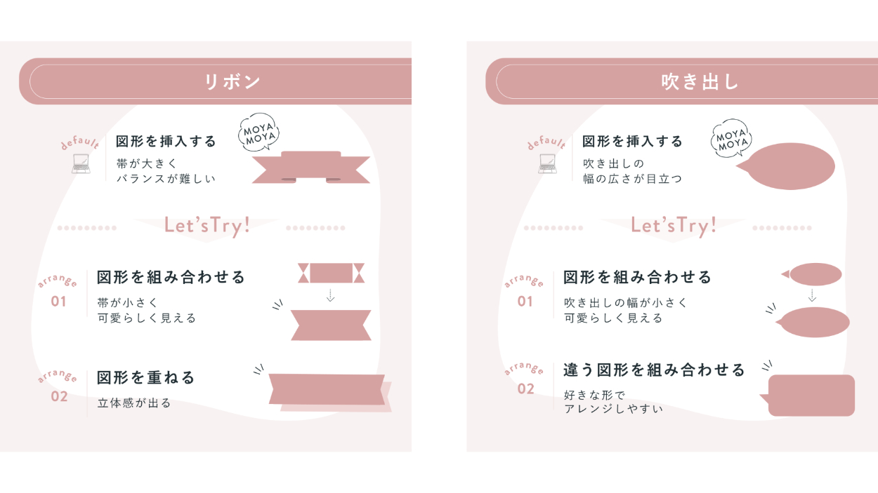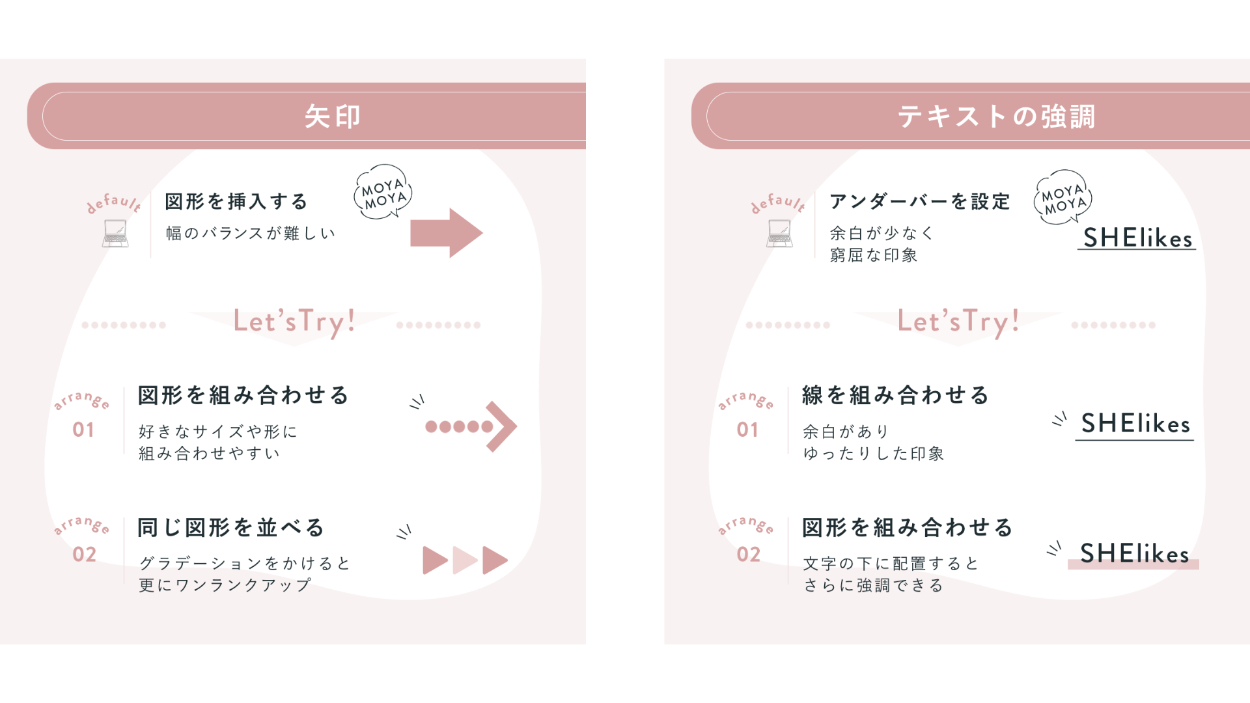 パワーポイントが元々持っている機能を使った場合の「ちょっと気になる」を改善する方法を紹介する投稿内容を制作しました。アレンジ方法を複数紹介することにより、5つと言わずたくさんの情報を得られるお得感のある投稿としています。