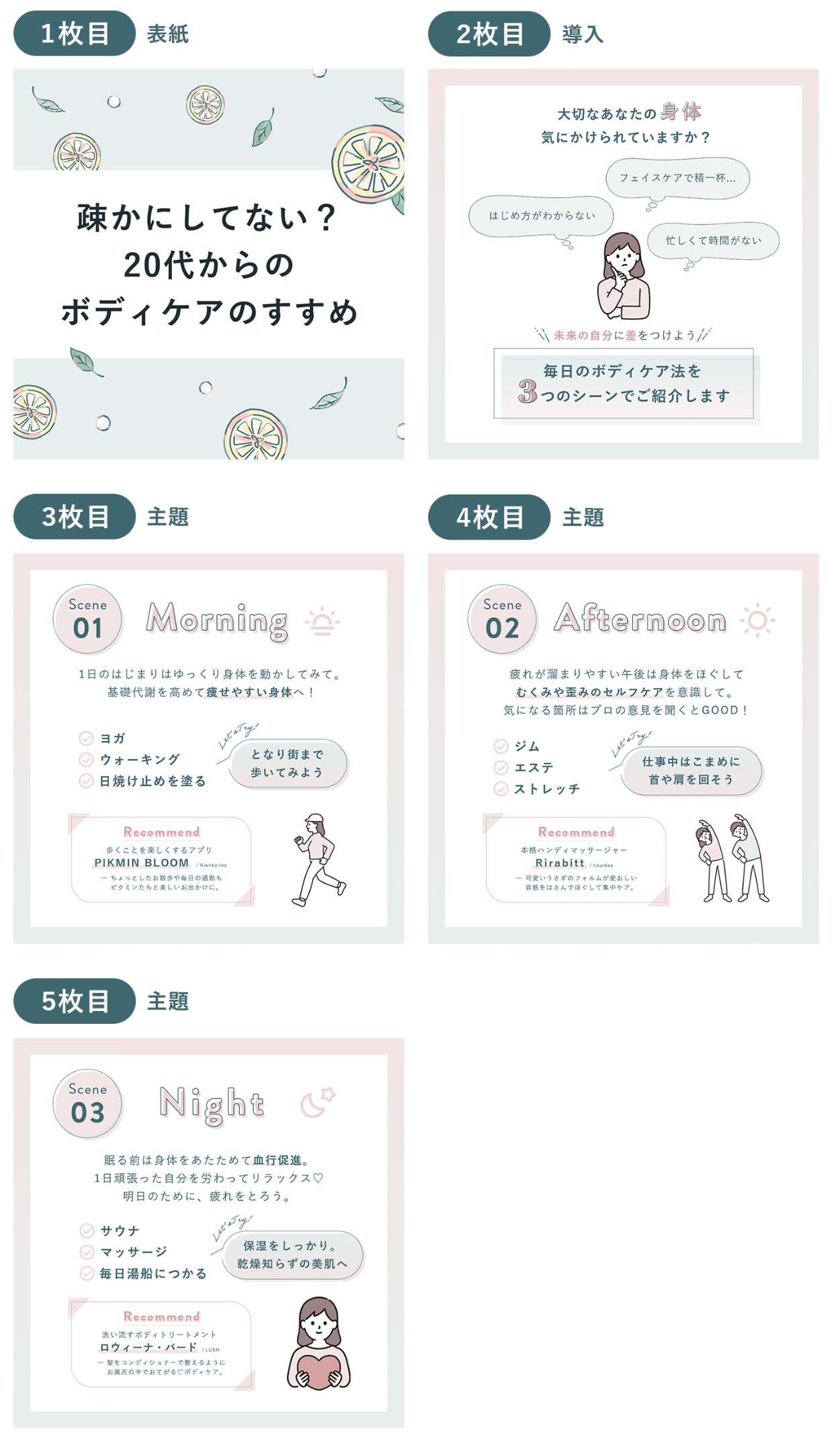 主題(3-5枚目):朝昼夜のシーンに分け、ボディケア方法とアイテムを具体的に提案。