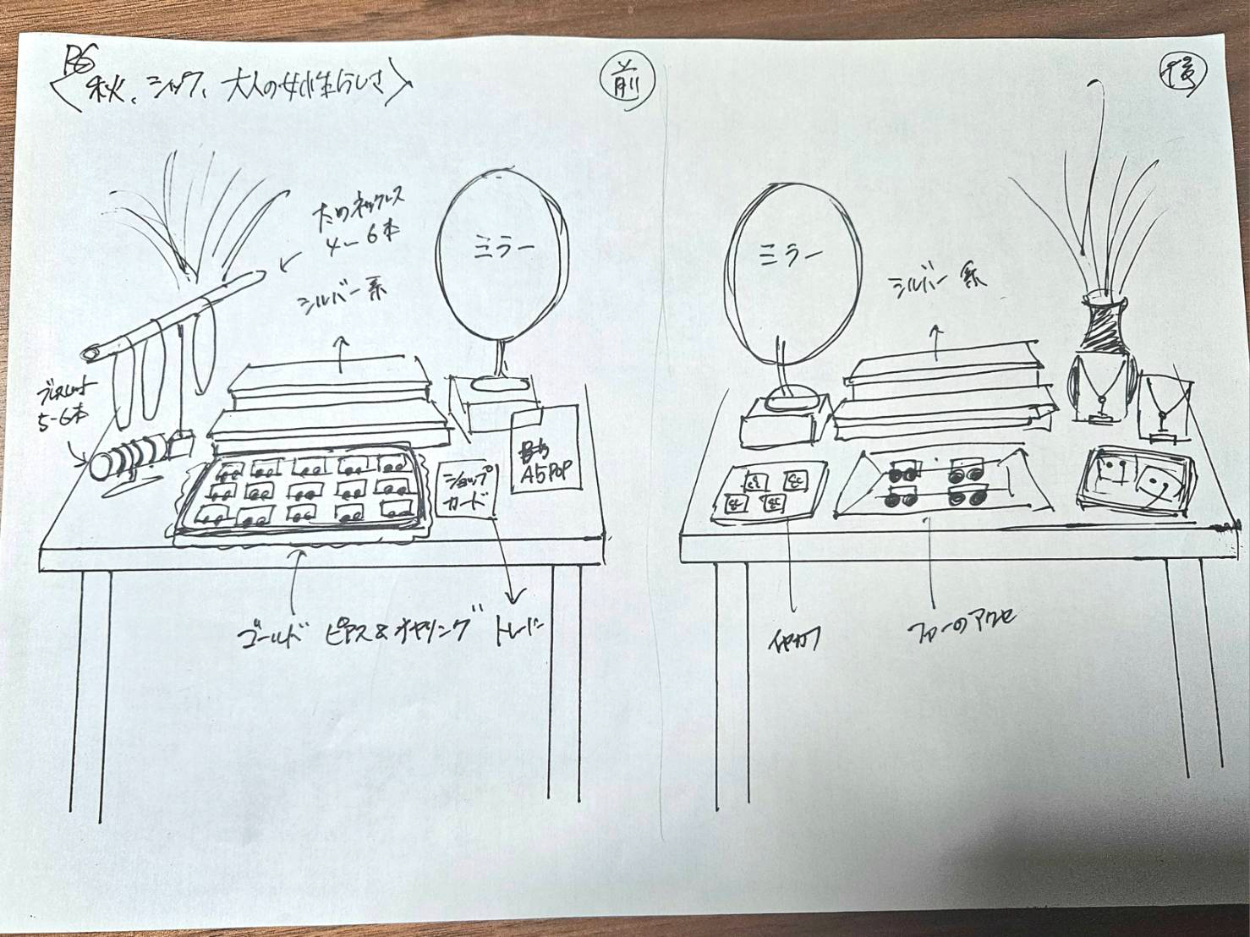 また、ネックレスの重ね付けの提案をディスプレイや接客を通じて行い、セットでの提案を行う。