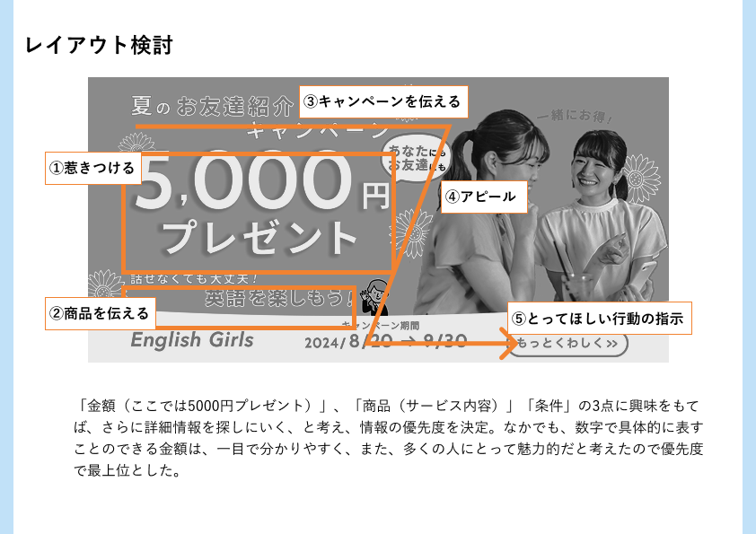 ユーザーストーリーを想定した情報の優先度付けの重要さを実感しました。そのバナーがクライアントからユーザーに「何を伝えたいのか」を明確にして、デザインに意味を持たせることができると感じました。