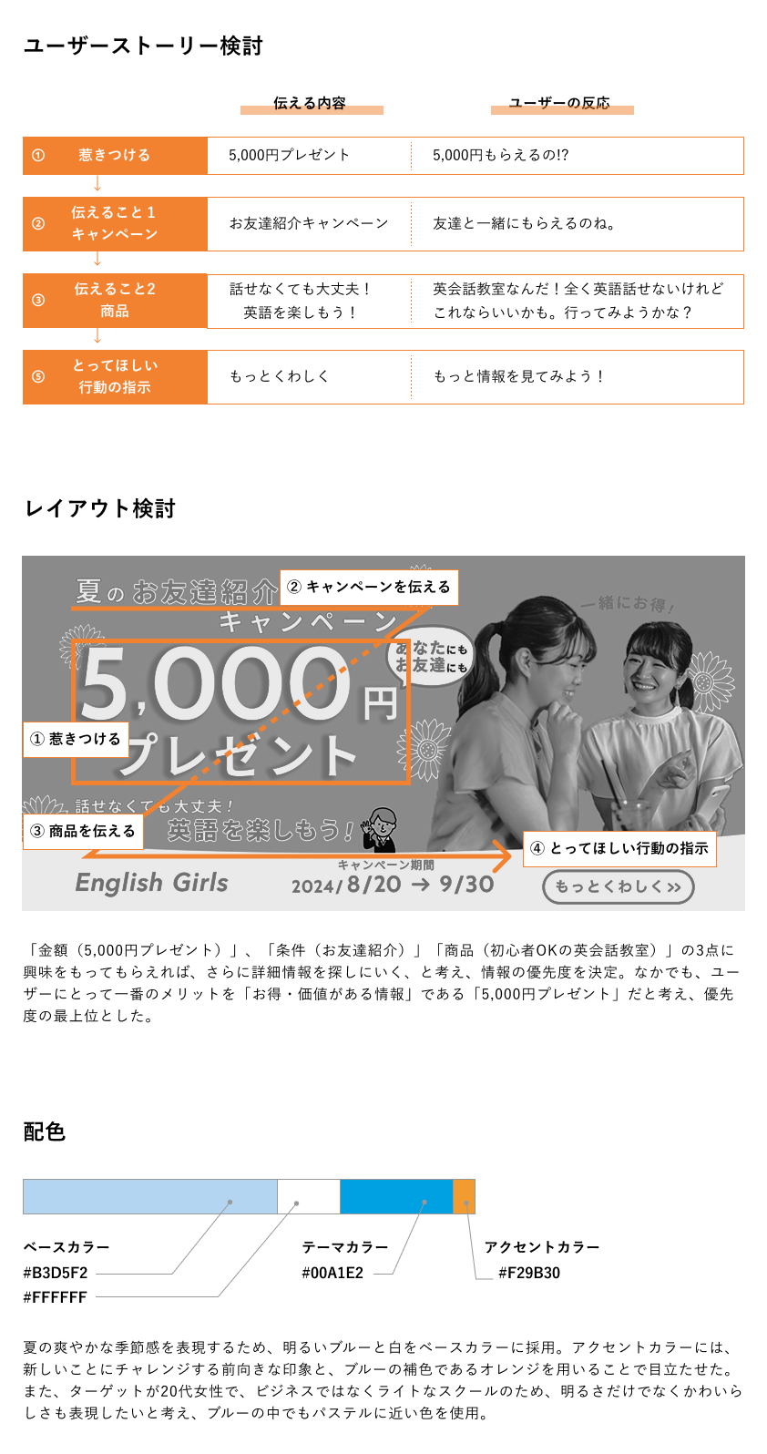ユーザーストーリーを想定した情報の優先度付けの重要さを実感しました。そのバナーがクライアントからユーザーに「何を伝えたいのか」を明確にして、デザインに意味を持たせることができると感じました。情報に優先度をつけた情報設計力を今後もさらに磨いていきます。