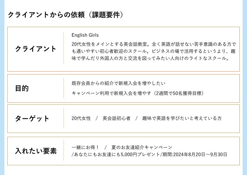 依頼内容を文面通りそのまま受け取るのではなく、クライアントがそのデザイン(制作物)を通して何を達成したいのかをくみ取れるデザイナーでありたいと強く感じました。