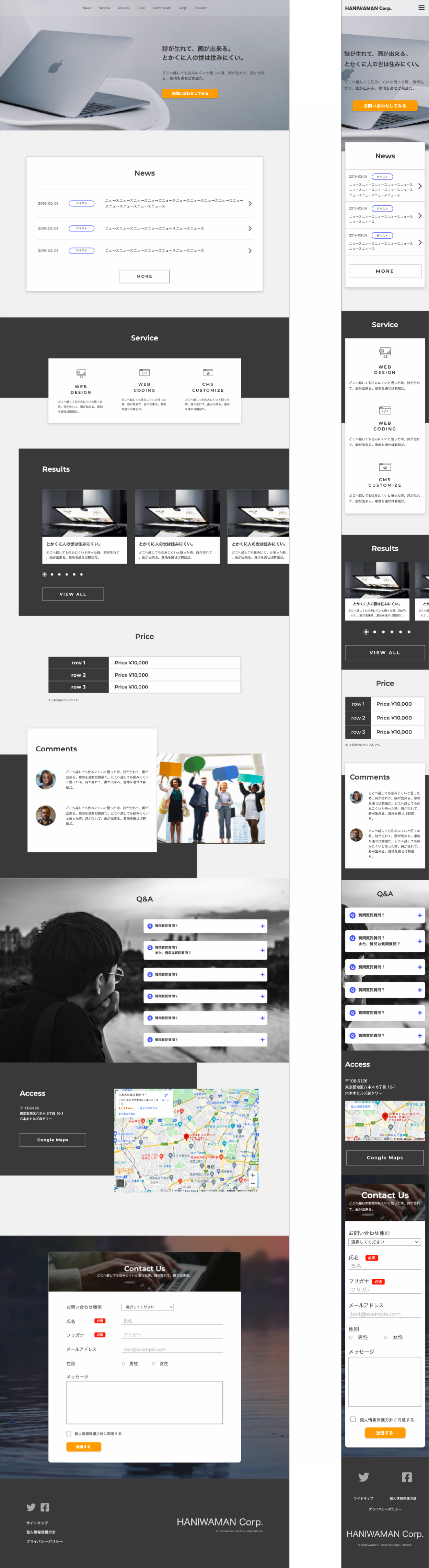 架空の会社「HANIWAMAN Corp.」のLPサイトのコーディングを実施。