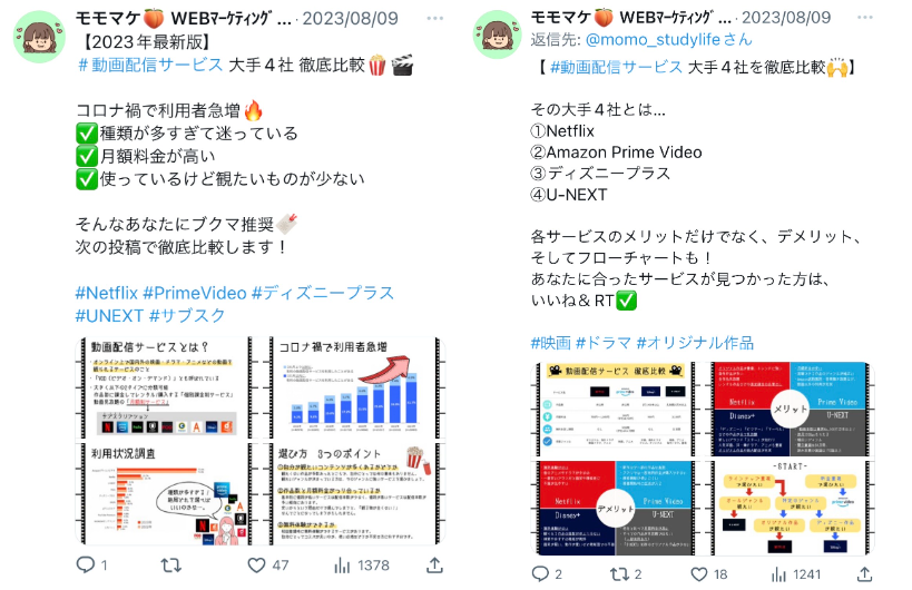 B投稿の2本目のインプレッションが極端に少ない結果になりました。原因としては、「平日の12時」に投稿したことが考えられます。お昼の貴重な時間にしては、文字量が多すぎました。