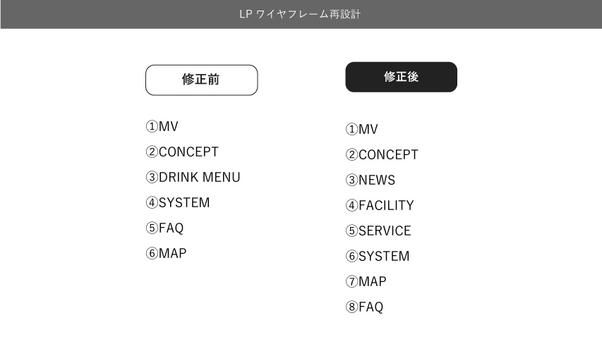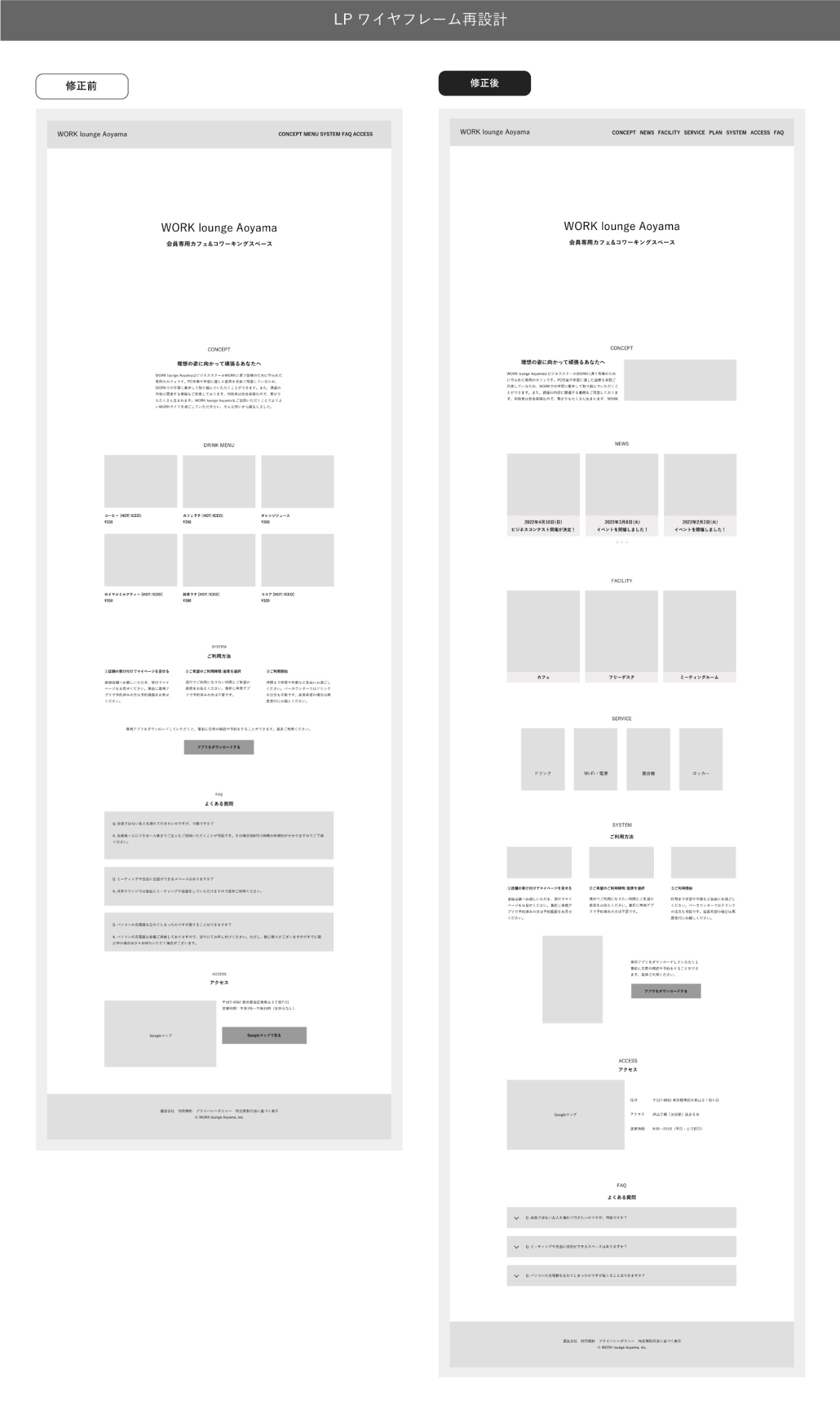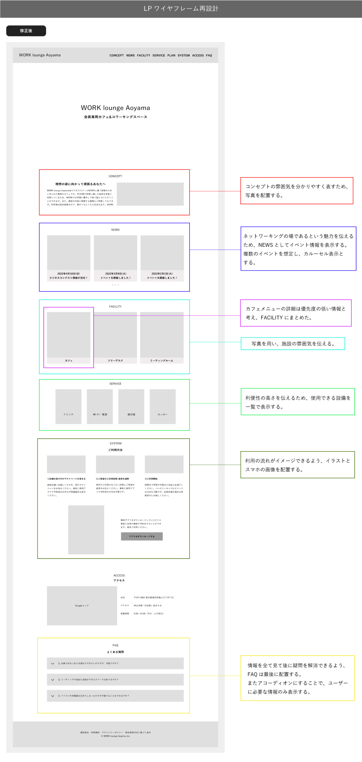 要件書、ユーザーストーリーをもとにLPワイヤーフレームの再設計を行いました。