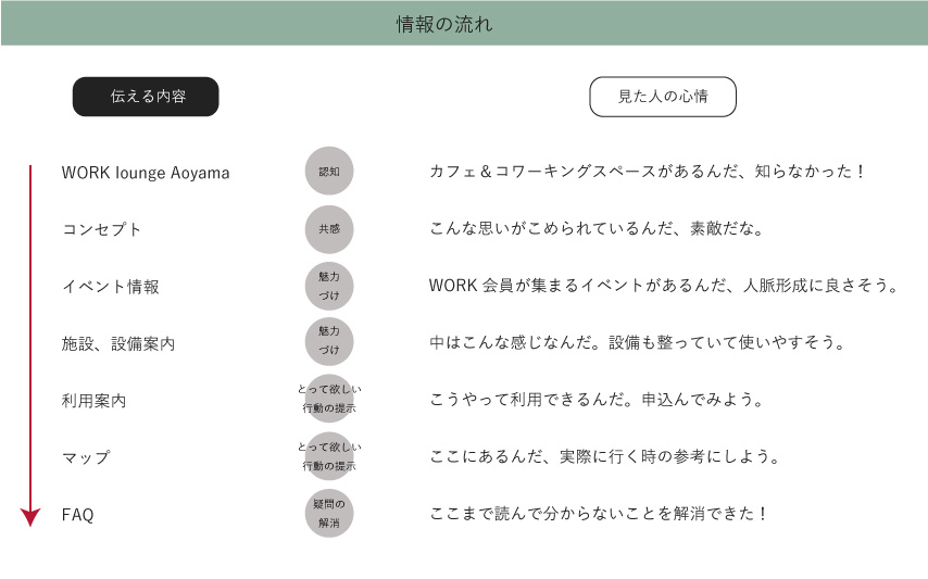 - ユーザーの思考の流れを意識したセクション順を考えることが、クライアントのゴールに結びつく。そのためクライアントとはペルソナの情報を事前にすり合わせる必要があると考える。