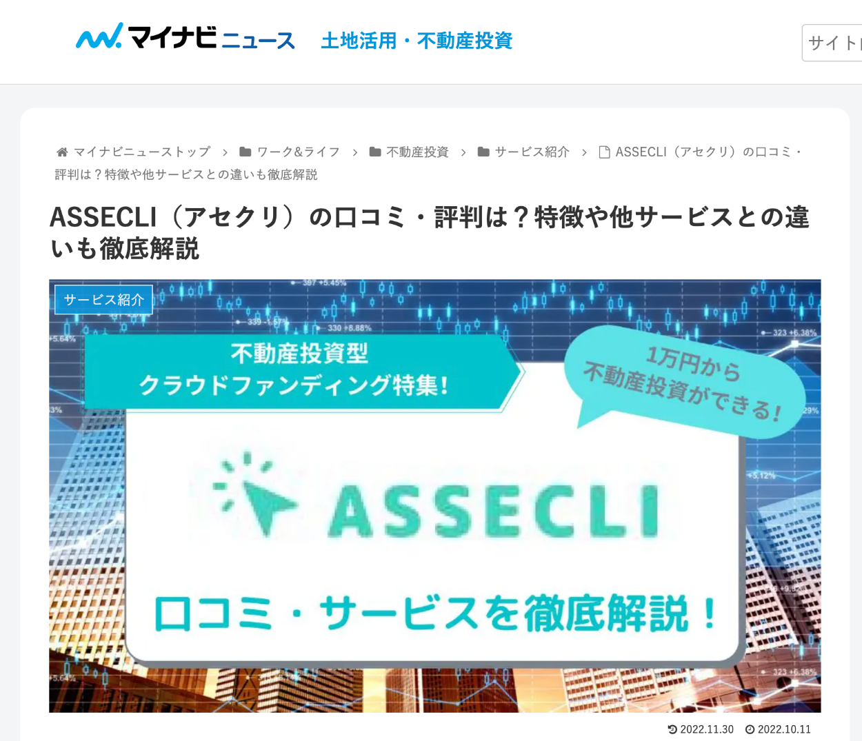 記事の特徴:不動産投資型クラウドファンディングサービス「ASSECLI」を紹介する記事。実際に利用した人を対象にアンケート調査をおこない、SNSの口コミも取り入れリアルな口コミや評判が分かる。ASSECLIとCOZUCHIやクラウドクレジットなど人気のサービス(ブラウザバックKWで出てくるサービス名)との比較要素もあり、ASSECLIと他のサービスとの違いは?というユーザーニーズを満たしつつ、SEO効果も見込める。投資を検討するユーザーにとっては、運営会社の情報や劣後比率も気になると予測できるため、それらを対策した見出しも作成した。