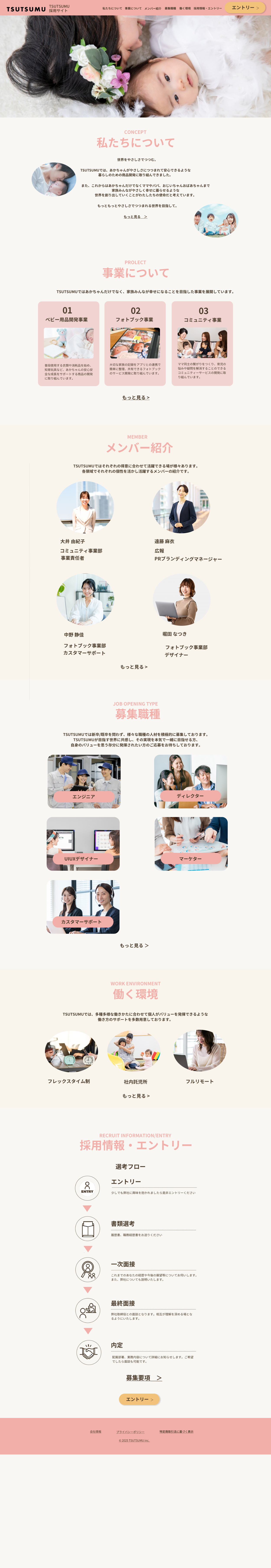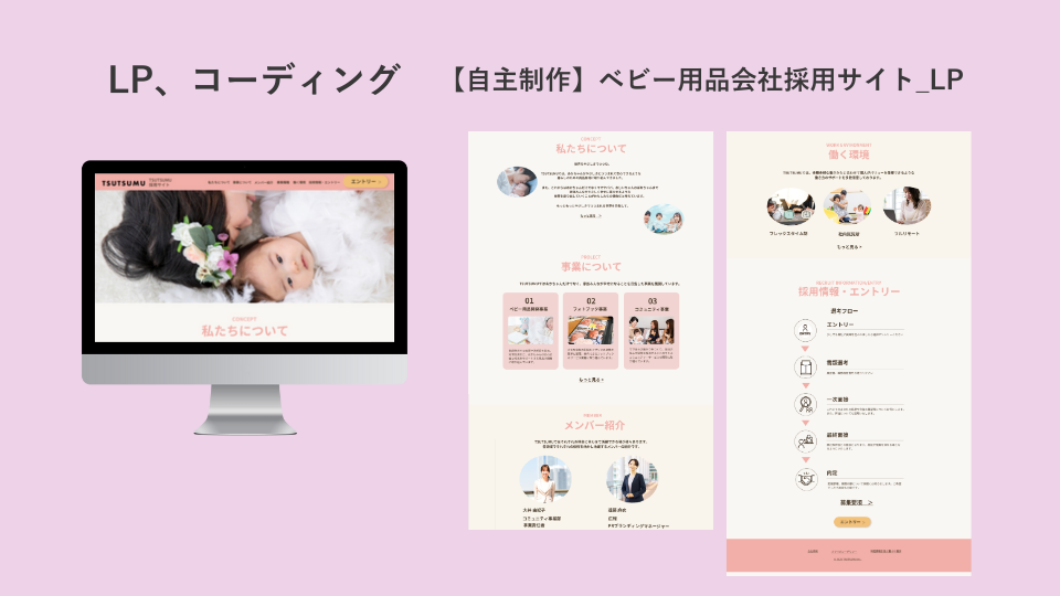 架空のベビー用品企業様の採用サイトのLP。レスポンシブ対応も制作。また、コーディング実装も行いました。