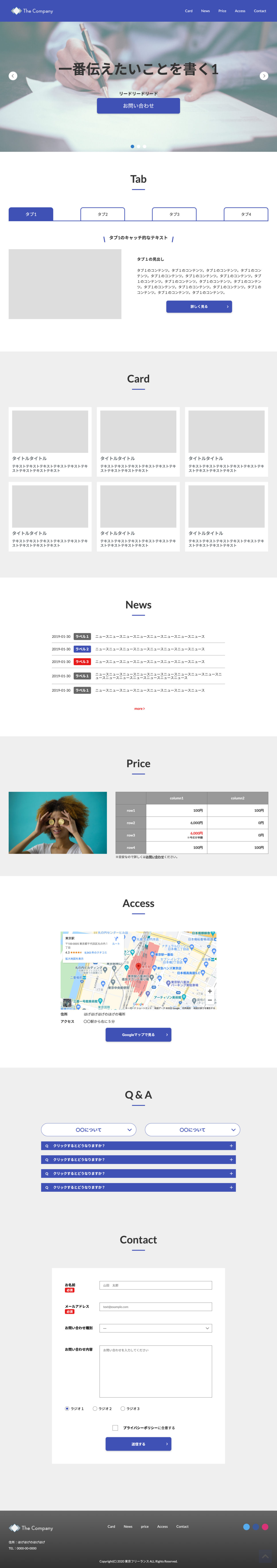 AdobeXDのデータからコーディングしました。タブの切り替え・よくある質問にはアコーディオン(クリックで下部に回答が開く)を実装しています。レスポンシブ・アニメーション対応済みです。