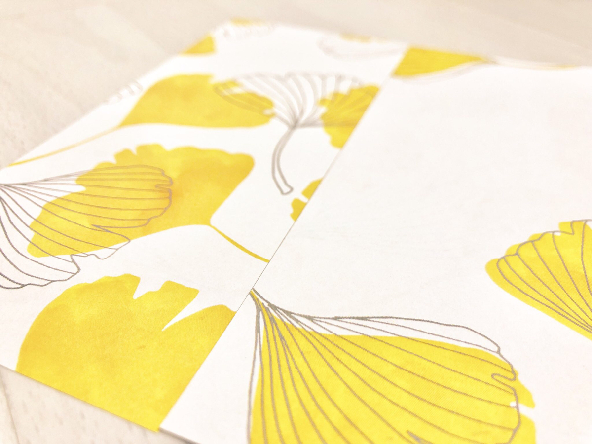 秋に映える一筆箋。裏面にも落ち葉が印刷されており、光にかざすと透けて見える。