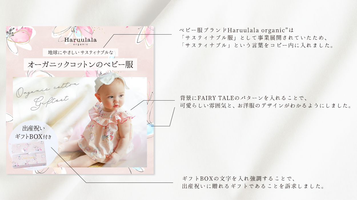 - ホームページより”ベビー服ブランドHaruulala organic”は「サスティナブル服」として事業展開されていたため、「サスティナブル」という言葉をコピー内に入れました。