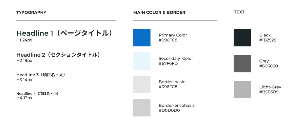 日付ごとに記載をする仕様+基本情報・行動予定を順序よく入力してもらうフローで作成することに決定しました。デザインにあたってフォントサイズ・カラーを定義。