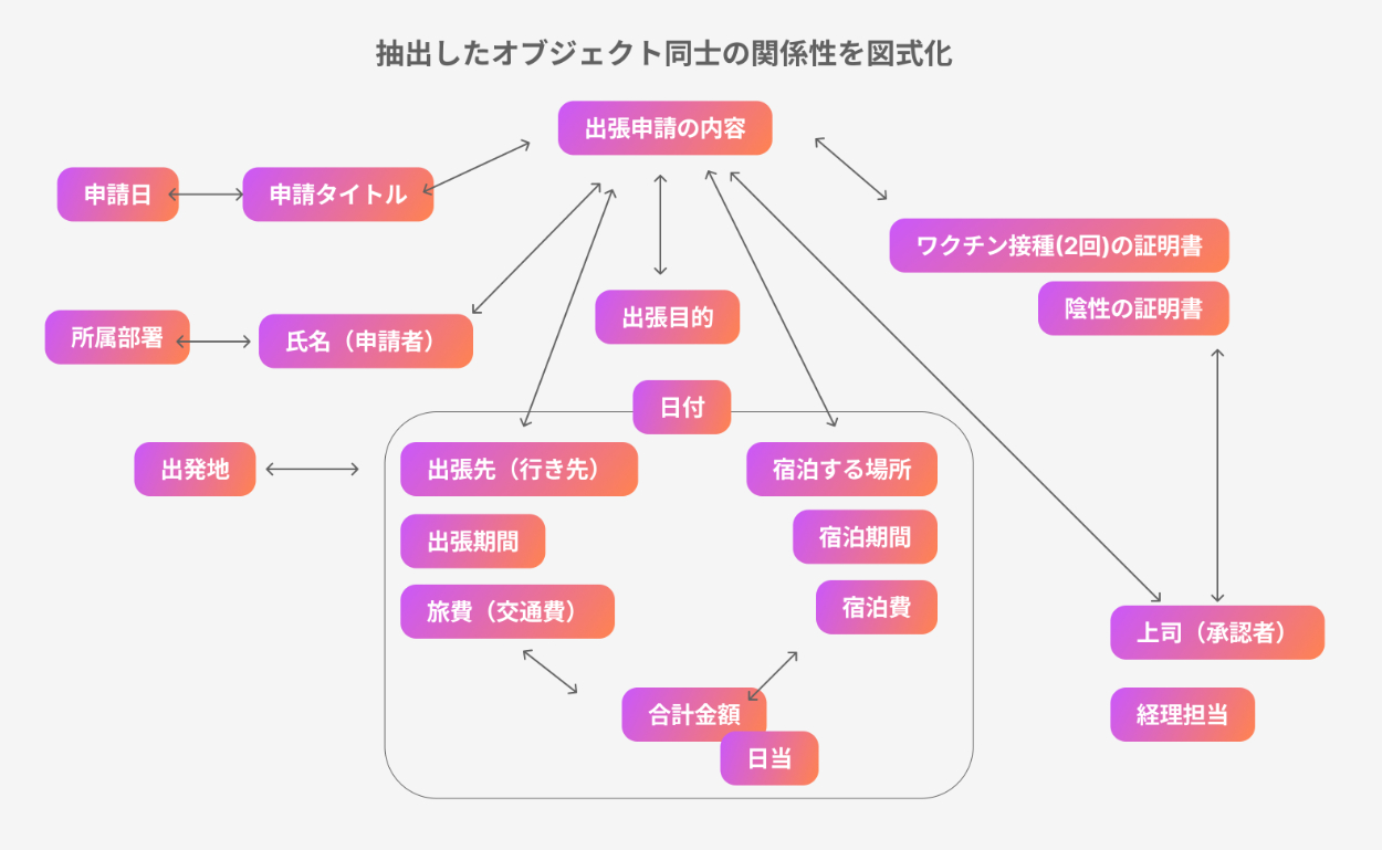 - 出張に関して情報(データ)として必要なメインオブジェクト(申請者、出張先、交通手段、宿泊など)を特定し、扱いやすい状態にすることができた