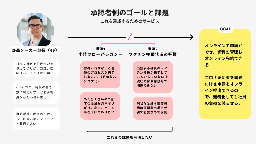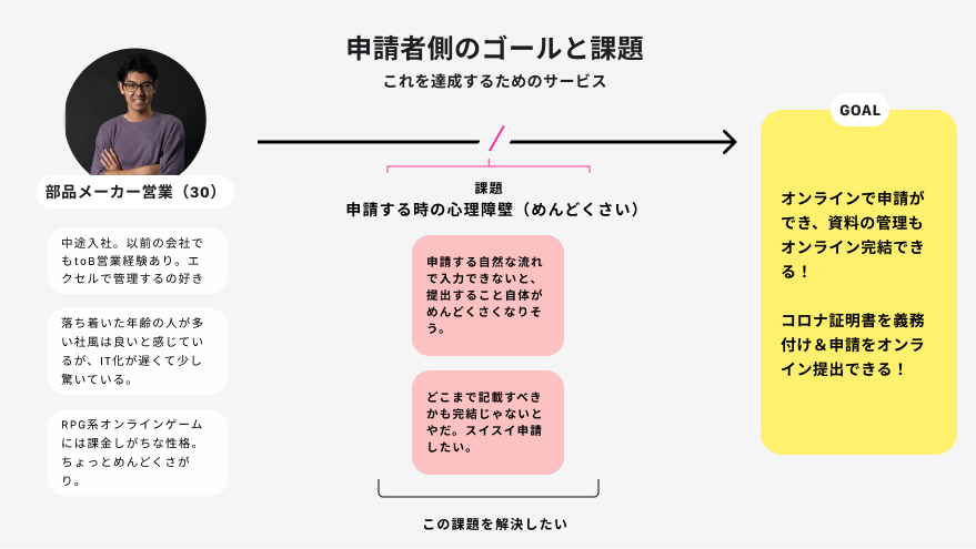 次に、実際のユーザーの課題解決に見合ったデザインを目指すため、サービス利用をするユーザーの設定を行い、現状の課題・何を解決することがゴールなのかを言語化し設定しました。