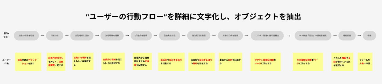 想定したユーザーの気持ちの動き・アクションに沿って行動フローを細かく言語化し、名詞をUI画面に表示させる候補としての「オブジェクト」をあぶり出す作業を行いました。