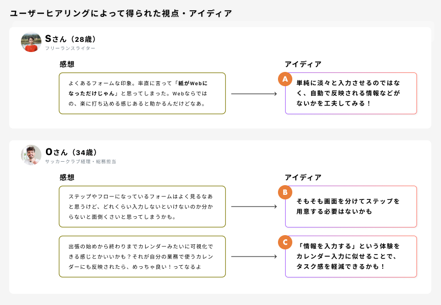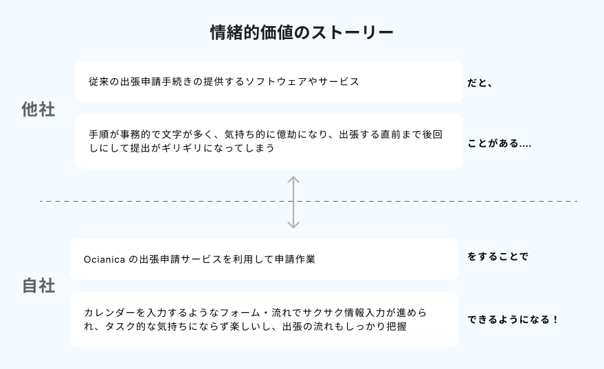 ヒアリングの結果、自分では気づけない新しい発見(A,B,C)があり、UI表現として取り入れるべきものが明確になりました。以上のことを踏まえ、今回作成した出張申請アプリケーションのサービス優位性を「機能的価値」と「情緒的価値」の側面から捉え直し、想定されるユーザーと照らし合わせながら言語化しました。