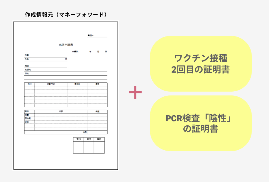 今回の自主制作では、出張申請アプリ作成にあたって基礎情報を最低限網羅したものを目指して作成しました。申請に必要な情報元として参考したのはマネーフォワードです。加えて、新型コロナウイルス感染症の証明書提出も出張する際には必要で要素であるため、条件設定としてこの2つをベースとしました。