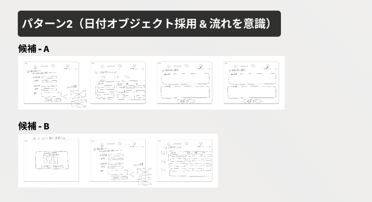 オブジェクトの抽出作業を終えたのち、実際のデザイン入れをするため方向性の確認を行いました。どのオブジェクトを、どういった順序で配置することが自然であり、ユーザーにとってもベターかを洗い出すことが目的です。