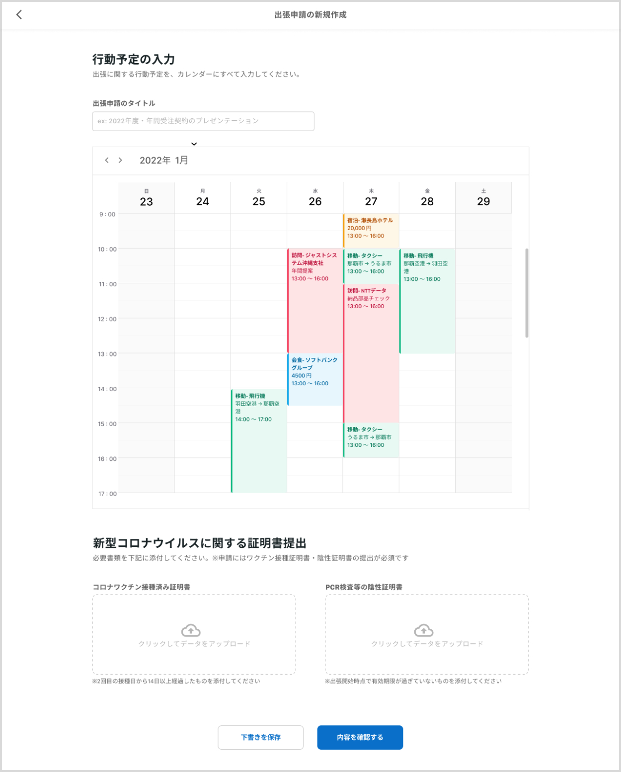 - 申請フローに「カレンダー的に出張予定を記入してもらう」体験を取り入れることで、タスク的なものをこなす思考にならず、楽な気持ちで入力ができる点